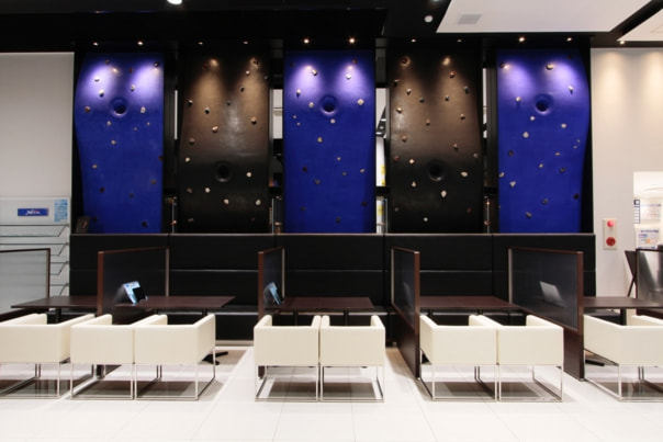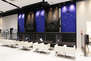 5 面にわたる壁面は、黒と青の土壁に構成されている