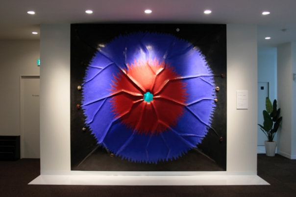 This wall is composed of five black and blue panels.