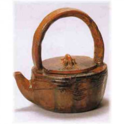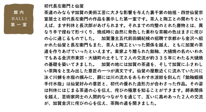 The works of the 4th of Senso, the founder of Urasenke style which influenced not only the tea ceremony but also the whole art of the Kaga district, and of the 1st Chozaemon are exhibited in Hall 1.What is concerning craft men and tea ceremony masters, first of all, it essential to mention Rikyu and Chojiro. Till their time, the image of what is good Chinese vessel (Karamono) was that it is shaped by hand and the simple color of the glaze, which was naturally acquired by temperature processing, thus giving it more attractiveness. Senso and Chozaemon invited from Kyoto to Kanazawa by Maeda Tsunanori, the 5th lord of the Kaga clan, overcame just the tea ceremony master and craftsman relation, and together created tea ceremony of Kaga. Ohi Amber, presented by clan Raku, soil of the Ohi street (this street islocated in the east part of Kanazawa and from it Ohi ware takes its name) and collaborative work of 2 person created the basics Ohi ware lasting for approximately 335 years.One of the big achievements was whirlpool design, which gave birth to the tradition of drinking tea of the Kaga district, using tea bouls appropriate to Kaga. One of the masterpieces in this style, which combined excellent skills and was favored by Senso, is "Water container, with handle Ohi amber glaze", made by Ohi Chozaemon . River shrimp swimming in the river flowing near Senso's villa is an object for the nose part of this container, and water waves, which show the river flowing, are inscribed on the body. The form transmits the sole of the tea ceremony beginning since Rikyuu, and through it can be achieved the sense of calmness. The cooperation of those two masters, through there overcoming of just master-apprentice relations, and there personal connection as art men, helped both of them to achieve a higher level of art and opened the way to linkage of the tea ceremony with pottery art, transmitting the sole and calmness of Kanazawa (Kaga).