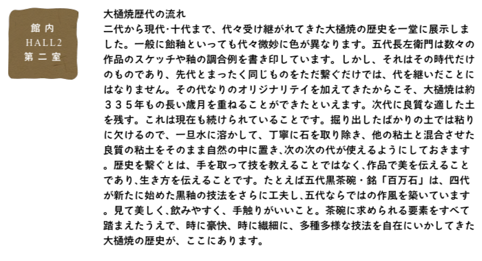 The history of Ohi Ware , which continues from the 2nd till the present 10th generation, is exhibited in the hall 2. Generally, the amber glaze is used to define Ohiyaki, but its color is subtly different from generation to generation. The preparation of amber glaze is particular to each generation. Certainly, the main reason of that is the changing of generations, but also, it is said, that the proportion of components for preparation was lost. Just copying works of the first generation does not mean that generation will succeede. It can be said that the originality of each generation is the very thing, which made it possible for Ohi Ware to pass through its approximately 335 years history.The amber glaze is not left to the next generation, but the clay remains. Because the clay, which was just dug out, lacks viscosity, in order to improve it and in order for the future generation to use it, the clay is courteously cleared out of stones and then is returned to nature. To continue the history is not teaching of technique by holding ones hand, it means the teaching beauty by showing works of art. This can be demonstrated with the "Hyakumangoku" of the 5th generation's black tea bowl. In this case the technique of black glaze, which was invented in the 4th generation, was developed farther and, a new style of 5th generation was founded. It is beautiful, pleasant to touch and drink from it. Ohi Ware combined all necessary elements for tea bowl, and above that all is dynamic and delicate to time, possesses various techniques, what is the very history of Ohiyaki.This exhibition hall introduces not only ceramics, but also the art in a wider meaning. Next to this Hall is a lecture hall, used for education and lecture meetings and can be used for exhibiting works of art with the 3rd hall.