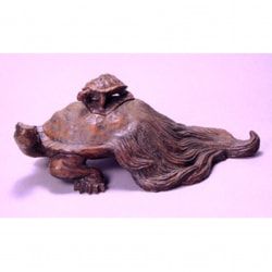 子亀の部分を火舎としている大香炉。大亀の造りはいかにも力強く、八代長左衛門の技が窺われる。総体に極めて薄く飴釉がかけられている。共蓋の蓋裏に「大亀 香炉 八代大樋宗春 印」と記されている