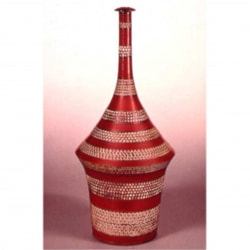 The bulk of Ohi Ware produced till the 9th generation is ceramics used primarily for the tea ceremony, but the 10th generation did not stop on that and started to combine traditional proceses with modern forms, philosophies and contemporary mediums. There are many art masters who was also doing this. For example, Hounsai Oiemoto, tea master of the 15th Urasenke, the master of ikebana Teshigawara Hiroshi, the former chief of temple Todaiji Nakagawa Shimizu Koshiyo and the artist Nakagawa Kazumasa - all embraced the combination of old and new.The works of the 10th Chozaemon and works of various people related to the history of Ohi Ware, represented through pictures, calligraphy, works made in various craftshops and so on are the works displayed in this hall.Ohi Ware is not just ceramics for the tea ceremony, made using the amber glaze, it is the world created by each generation. For example, the vessel "Rising", that was made by the 10th Chozaemon in the Ohi Mishima Style, received the Japan Art Academy Award. This work is unique in that is truly embraced the traditional tea ceremony style yet pushed the boundaries into producing truly modern art and this was something that had never been done before. In the future we are going to continue to introduce Ohi Ware which combine the tradition of the past generations with the philosophies and ideas of today.