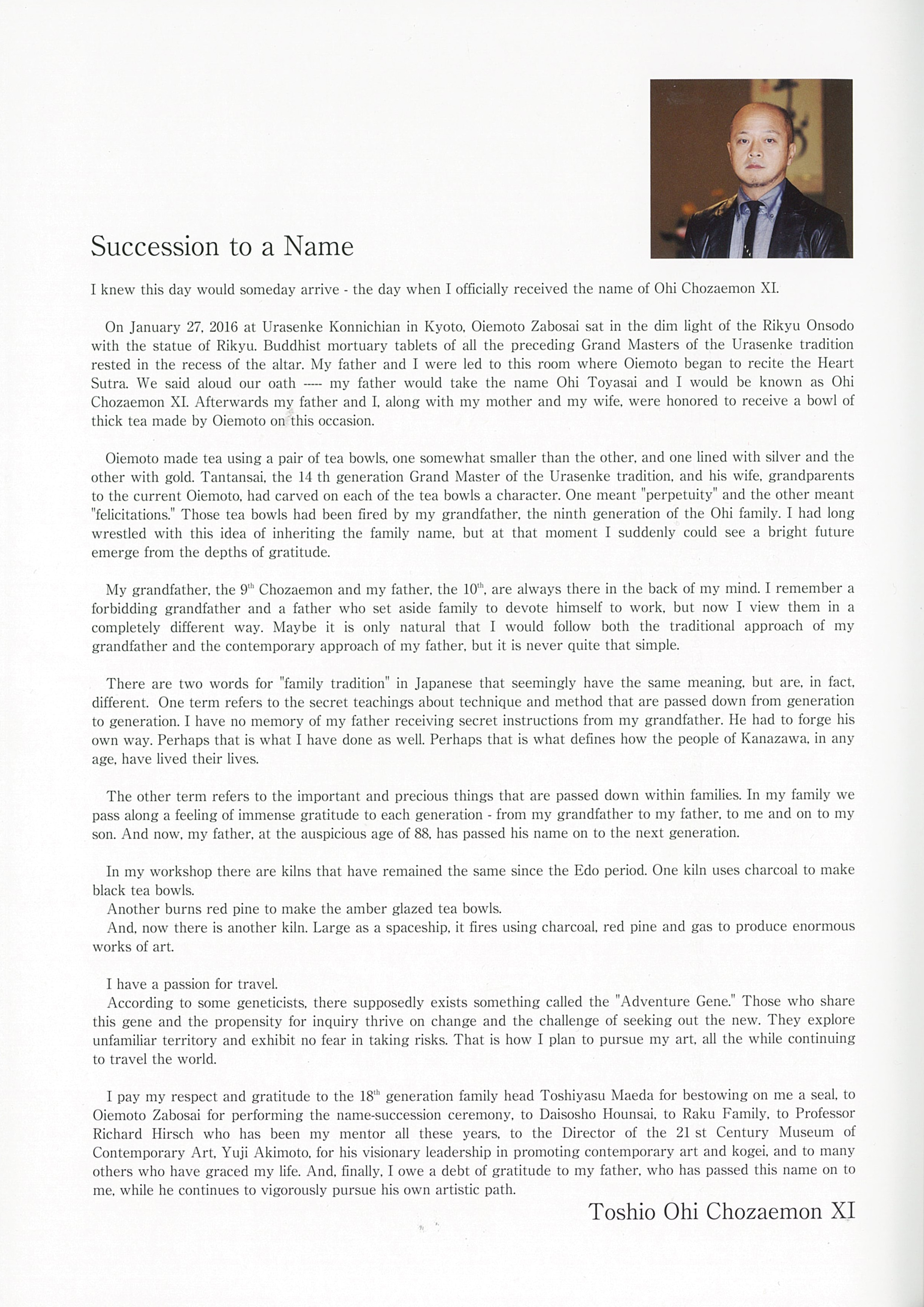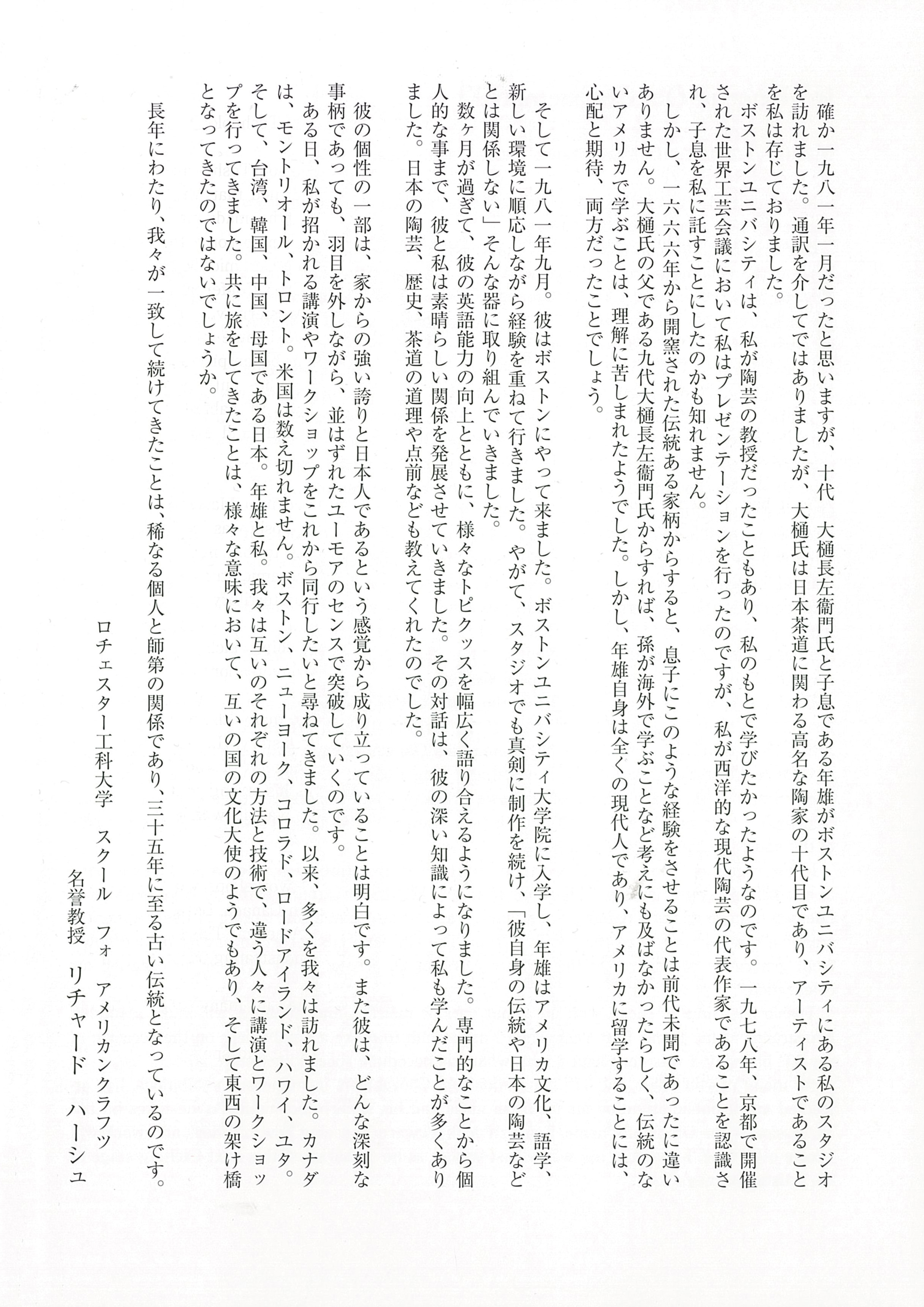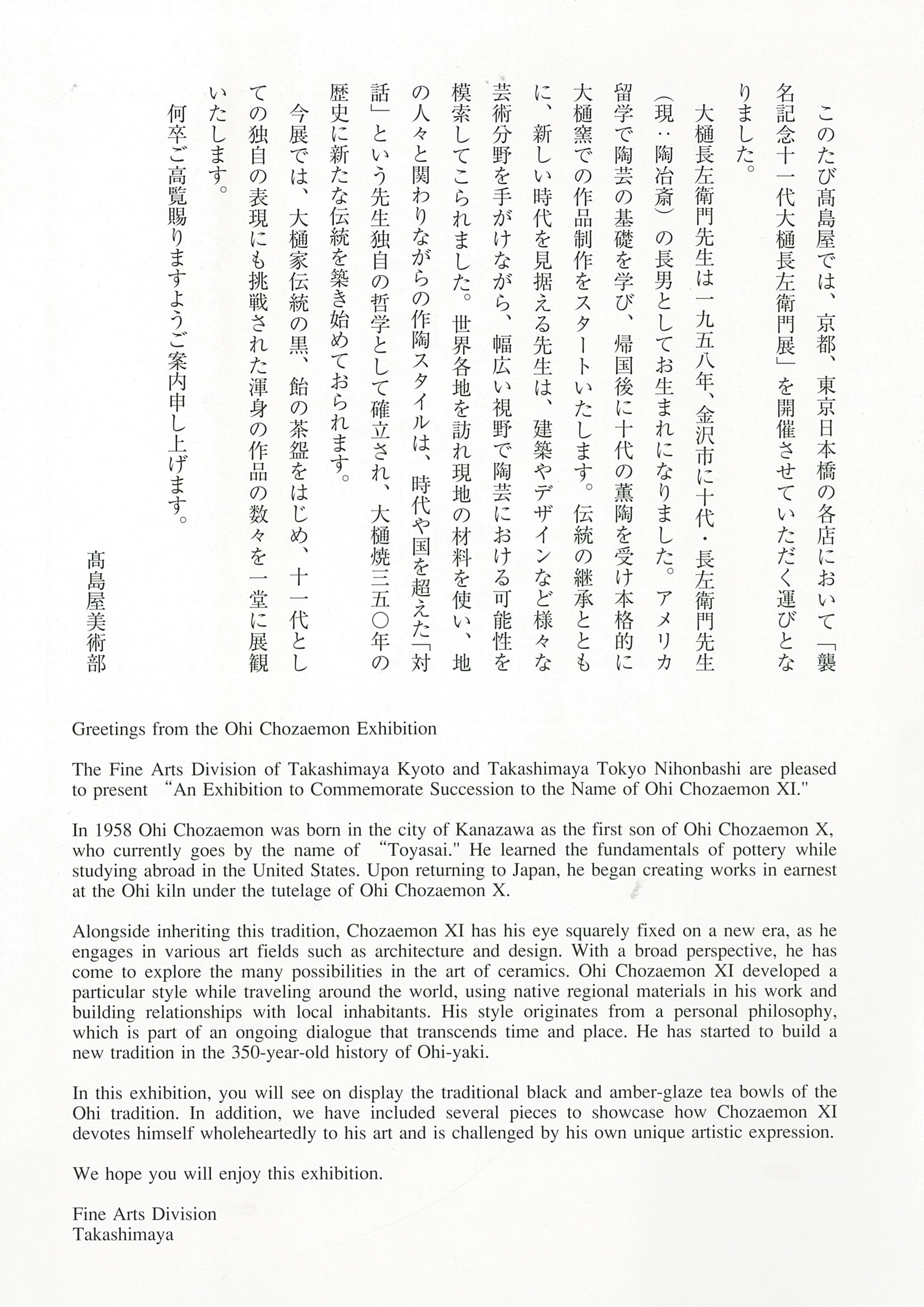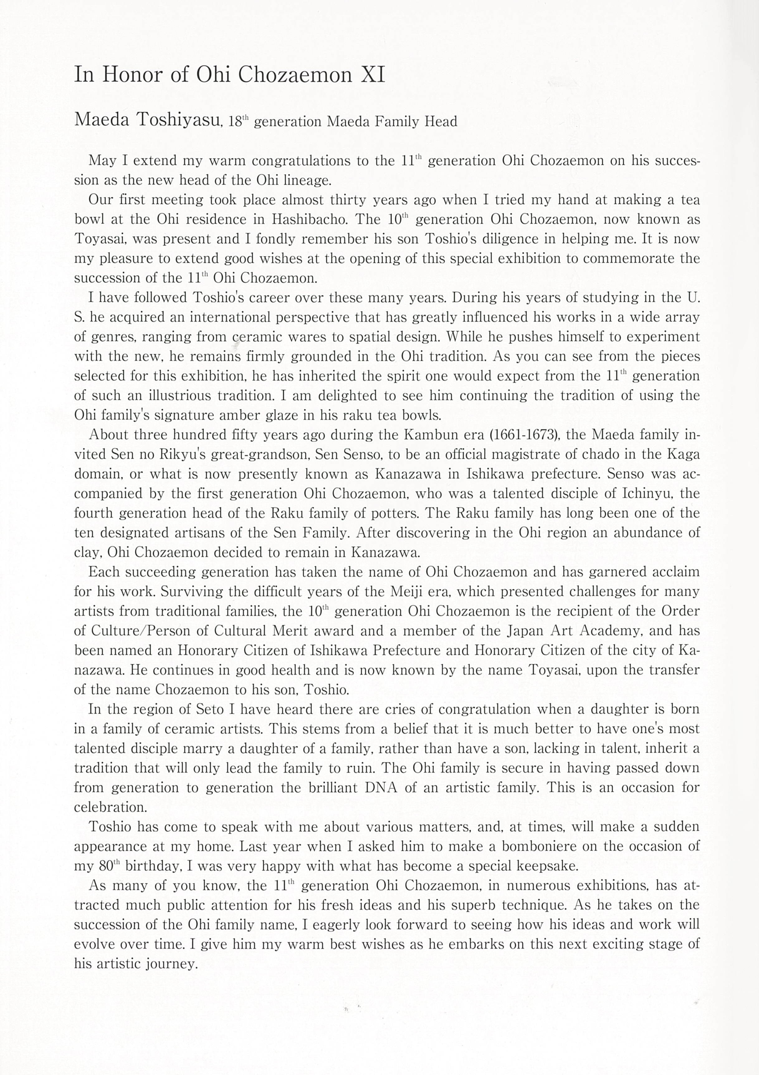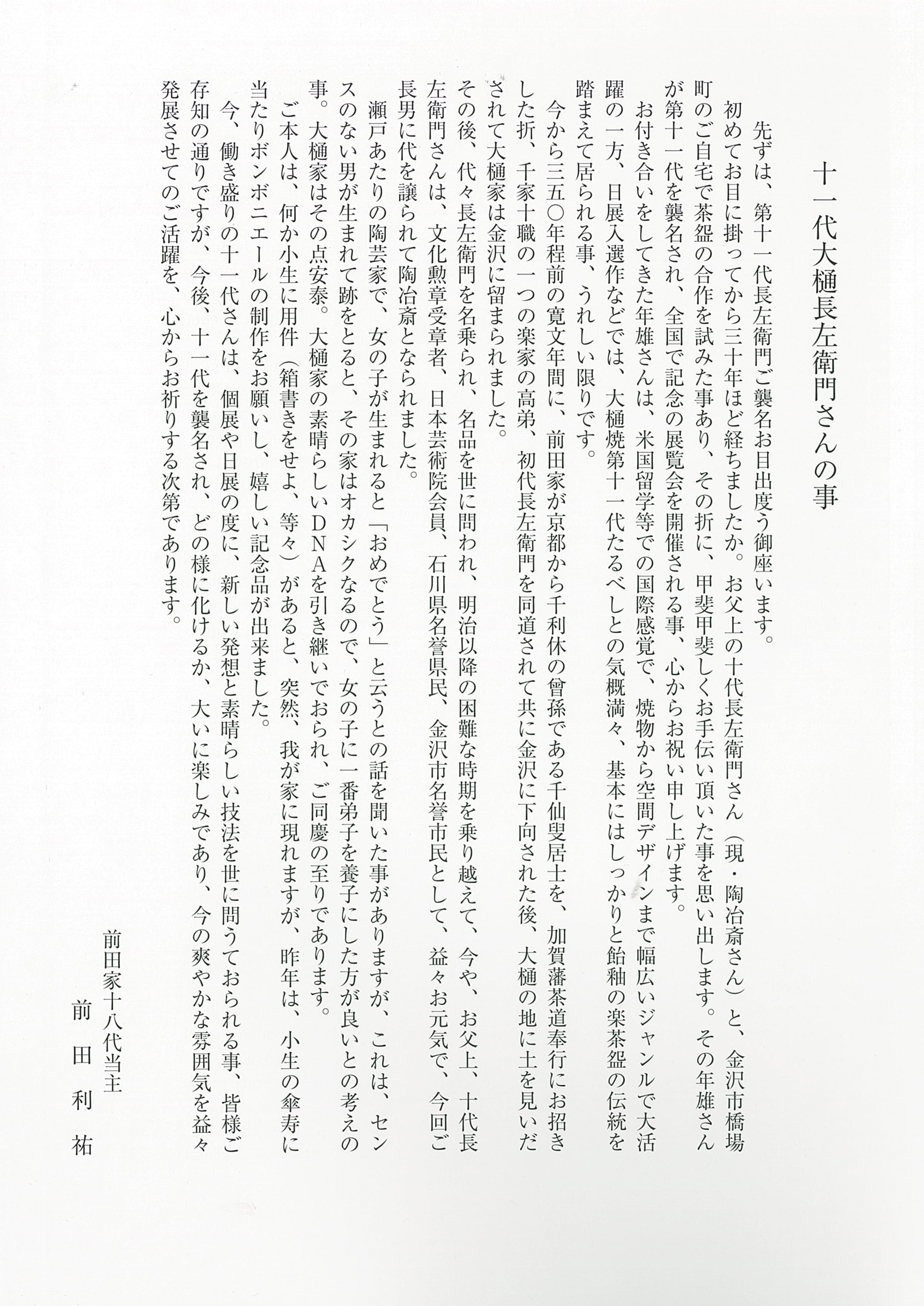 高島屋美術部様 前田家十八代当主 前田利祐様 Mr. Maeda Toshiyasu, 18th リチャード ハーシュ様 Mr. Richard Hirsch 秋元雄史様 Mr. Akimoto Yuji 十一代大樋長左衛門 Ohi Chozaemon XI ■日本橋 高島屋個展 6月8日 - 6月14日 ■京都 高島屋個展 5月25日 - 5月31日 20160526_北國新聞掲載/Hokkoku Newspaper ページトップへ