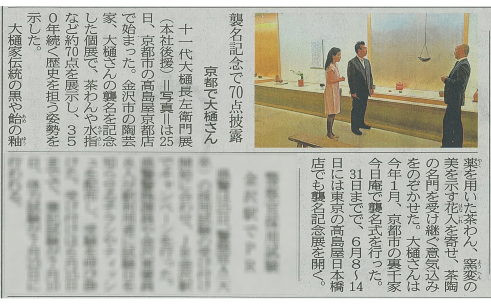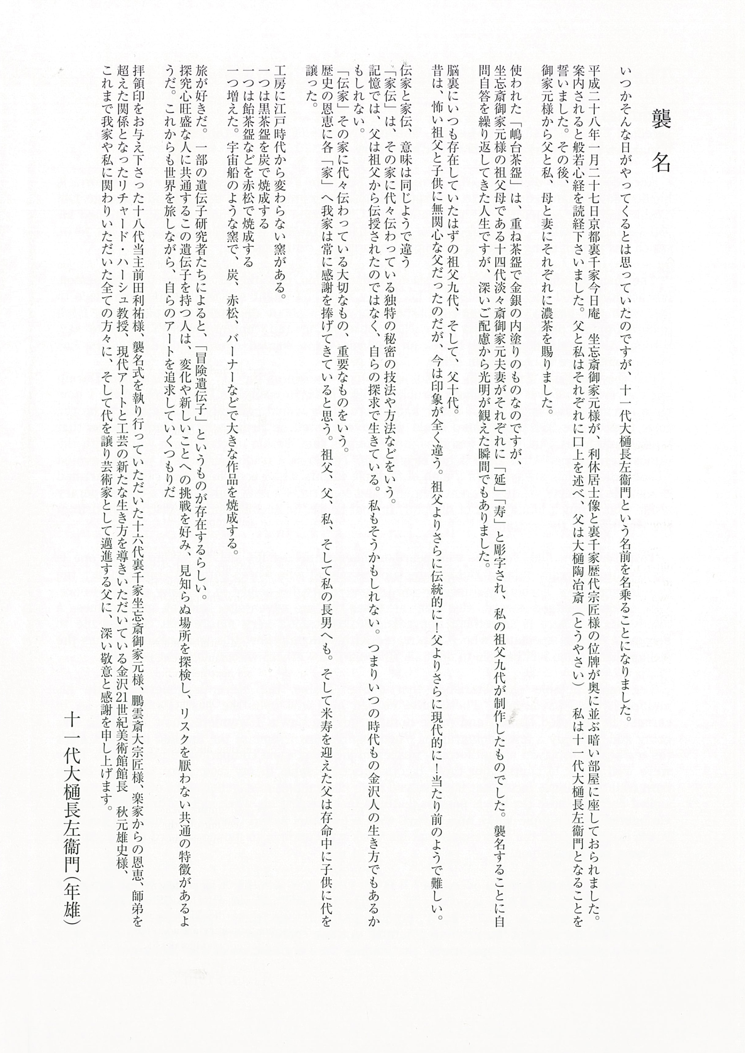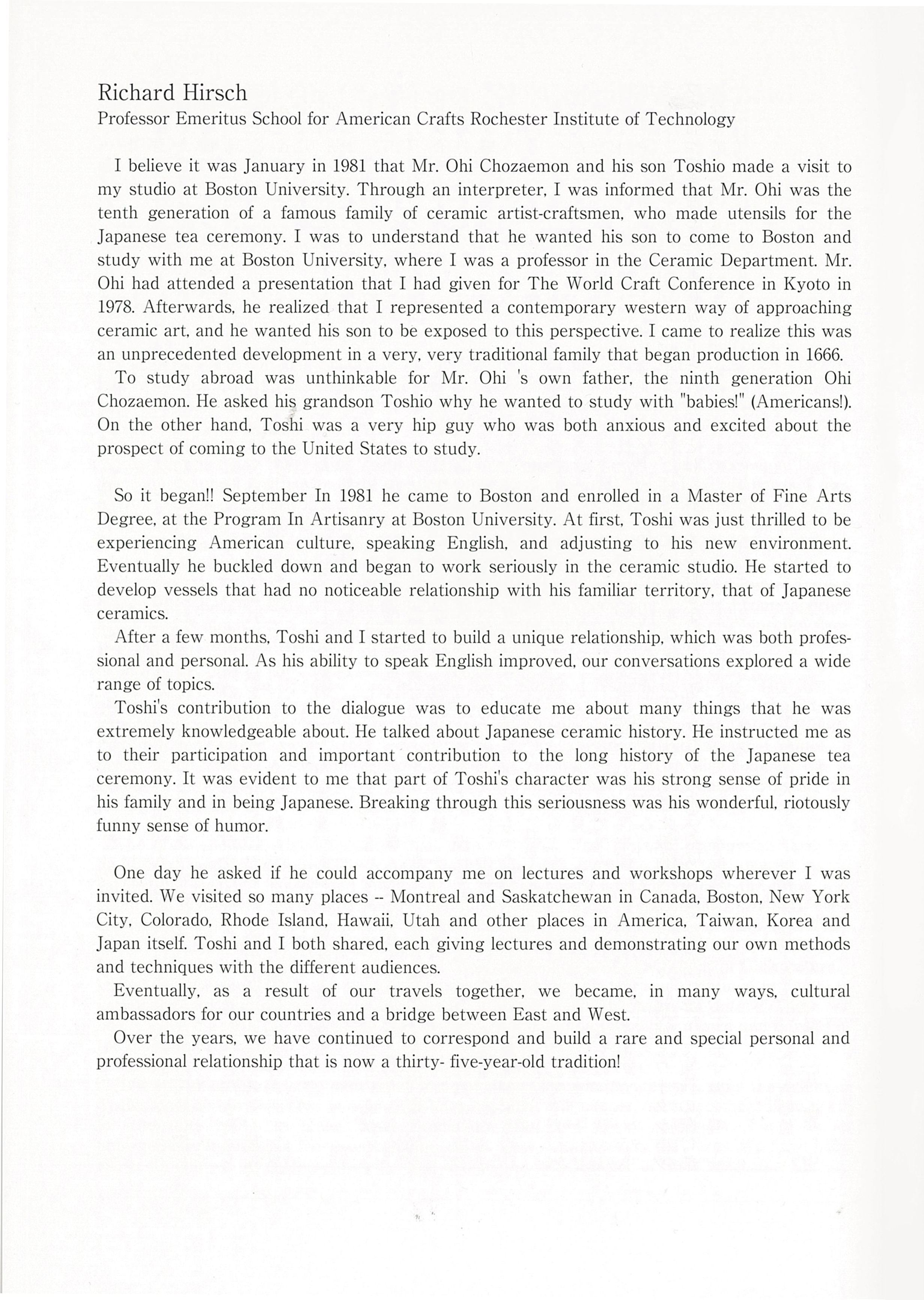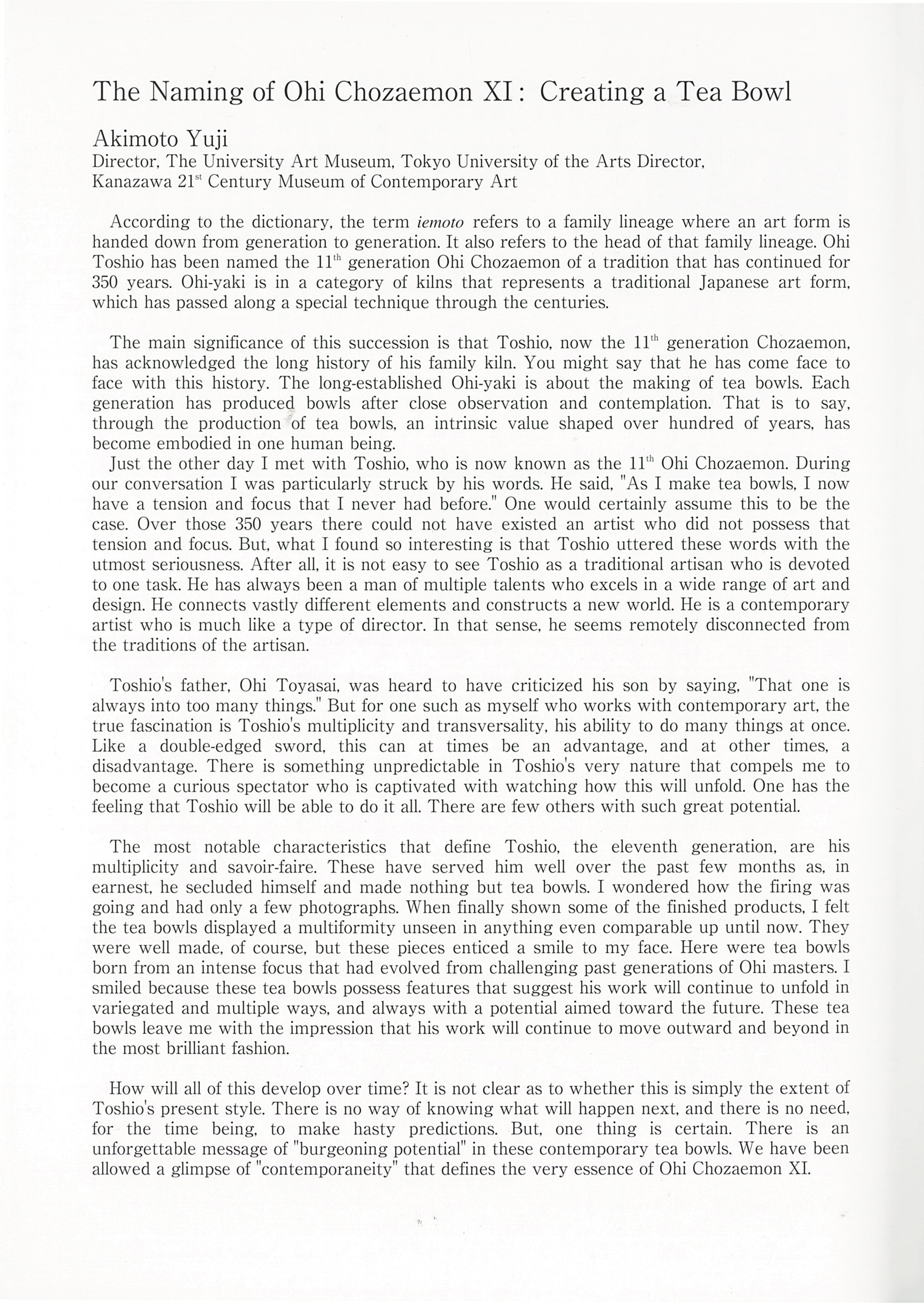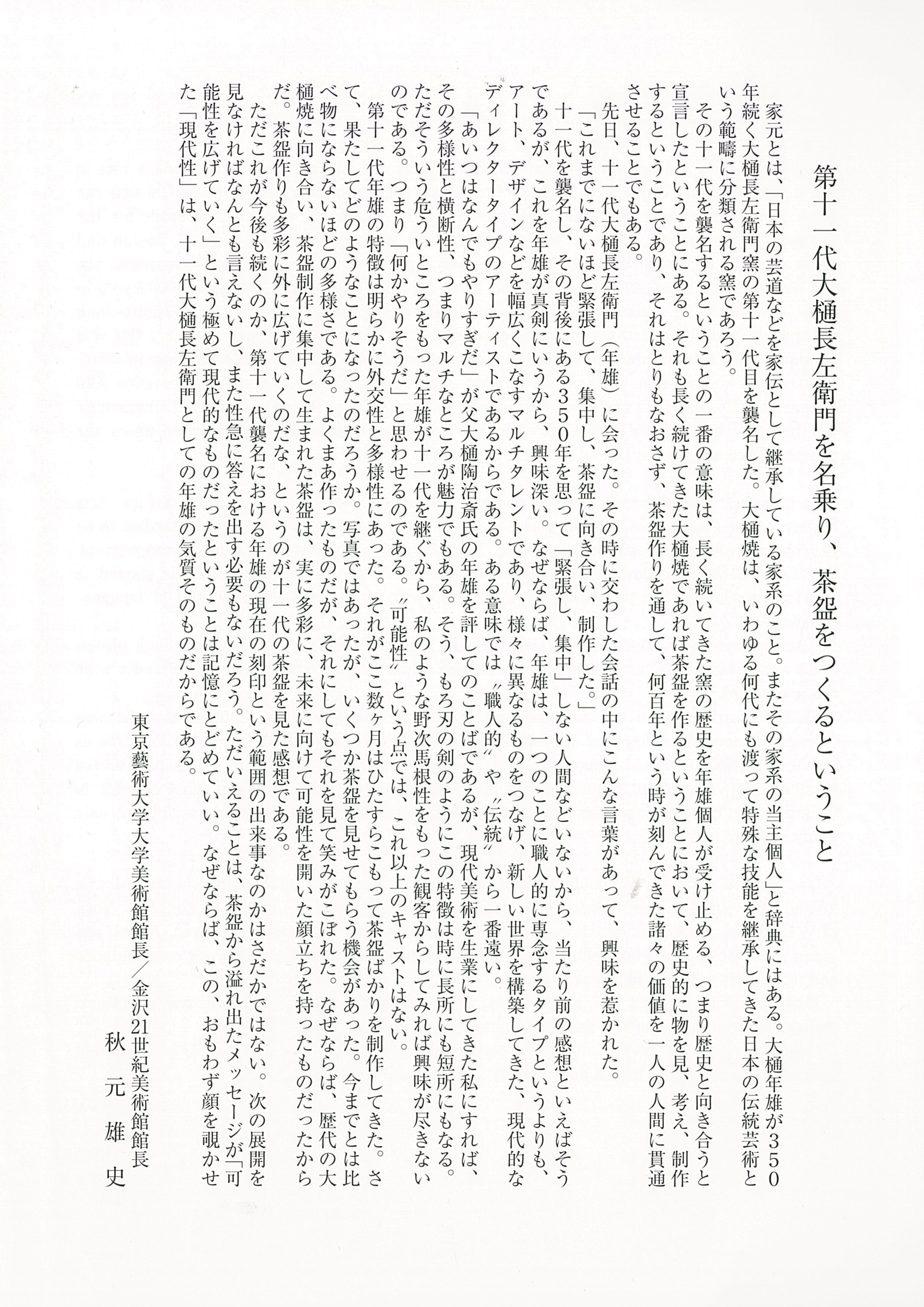 高島屋美術部様 前田家十八代当主 前田利祐様 Mr. Maeda Toshiyasu, 18th リチャード ハーシュ様 Mr. Richard Hirsch 秋元雄史様 Mr. Akimoto Yuji 十一代大樋長左衛門 Ohi Chozaemon XI ■日本橋 高島屋個展 6月8日 - 6月14日 ■京都 高島屋個展 5月25日 - 5月31日 20160526_北國新聞掲載/Hokkoku Newspaper ページトップへ
