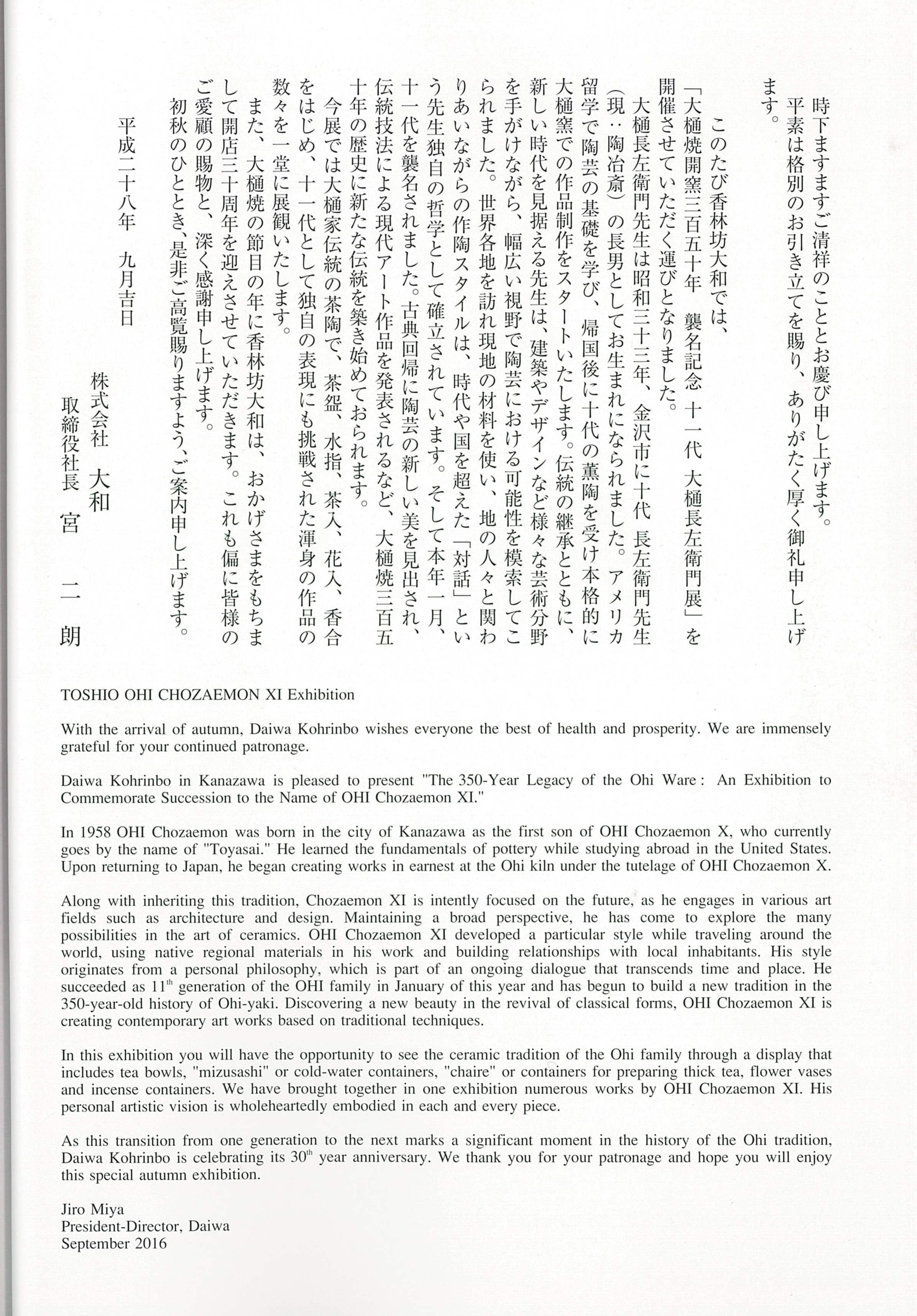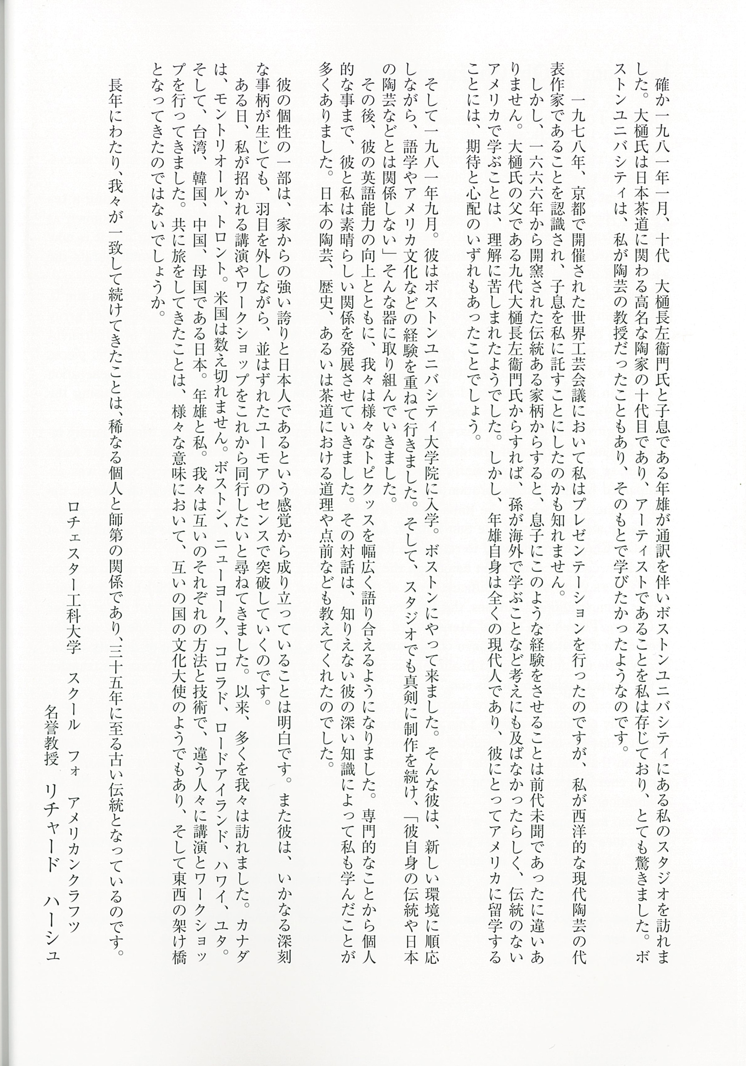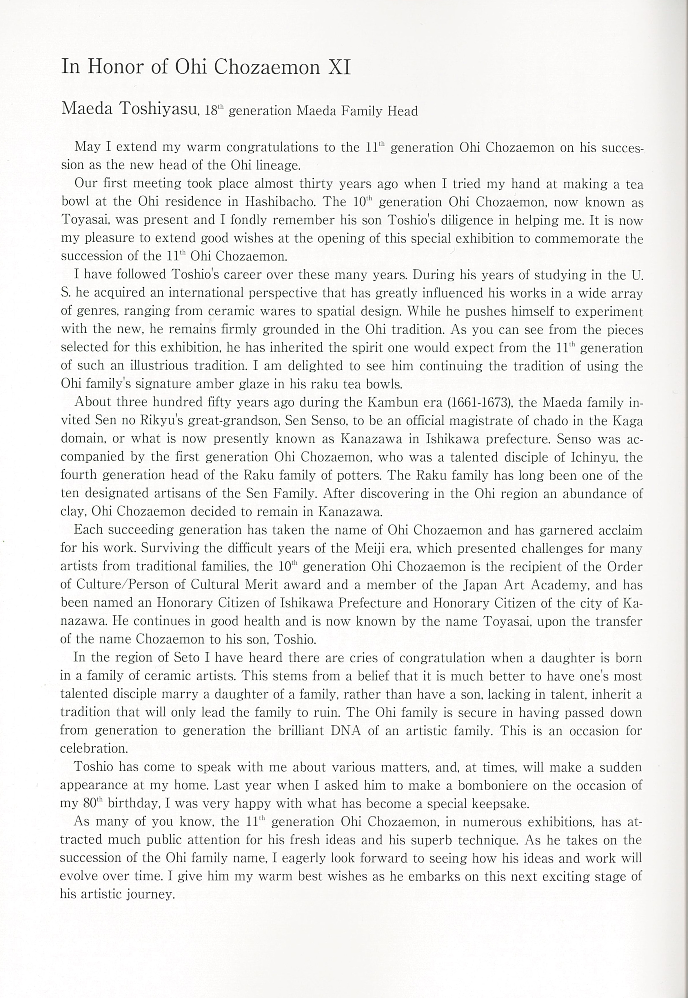 大和様 前田家十八代当主 前田利祐様 Mr. Maeda Toshiyasu, 18th リチャード ハーシュ様 Mr. Richard Hirsch 秋元雄史様 Mr. Akimoto Yuji 十一代大樋長左衛門 Ohi Chozaemon XI ページトップへ