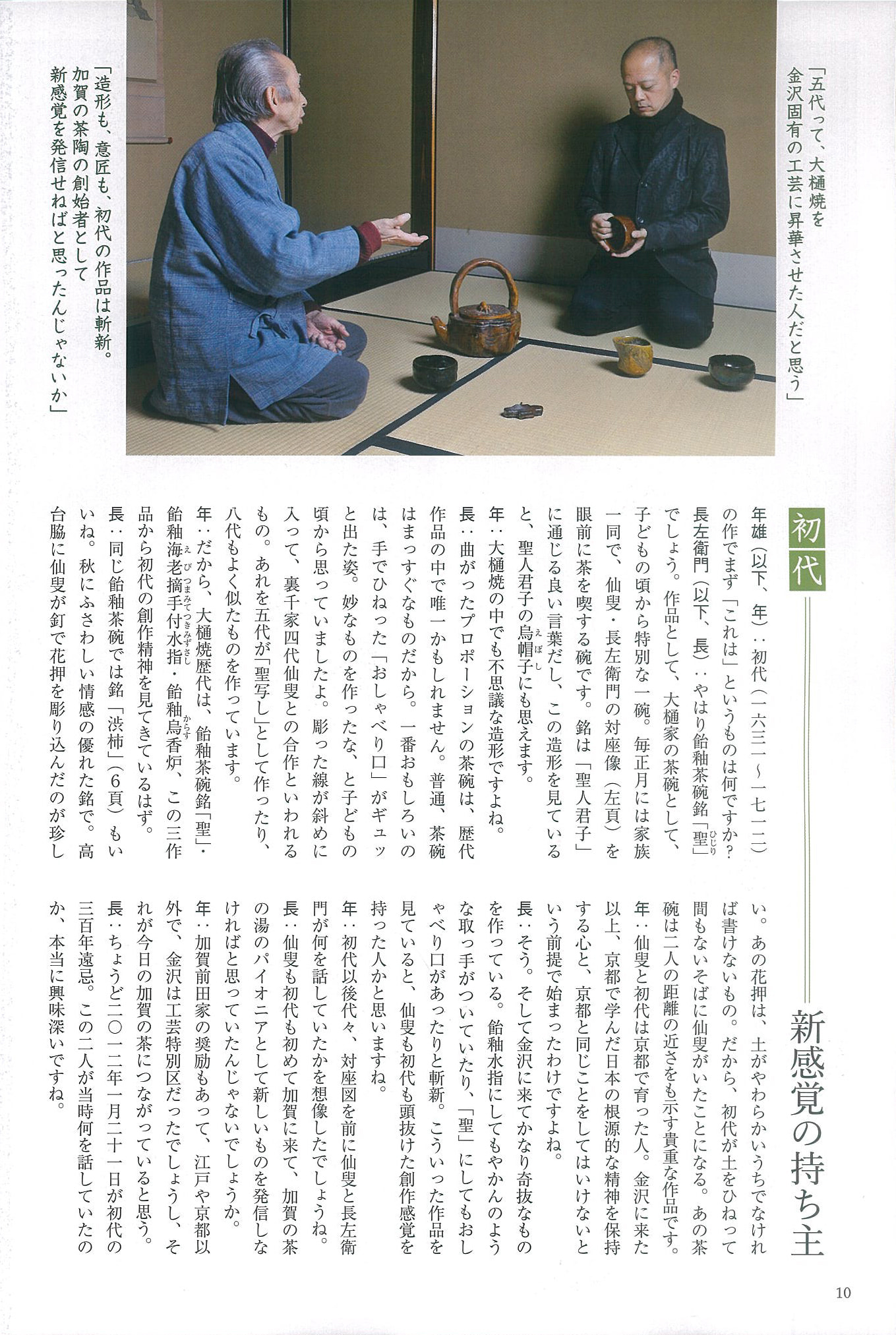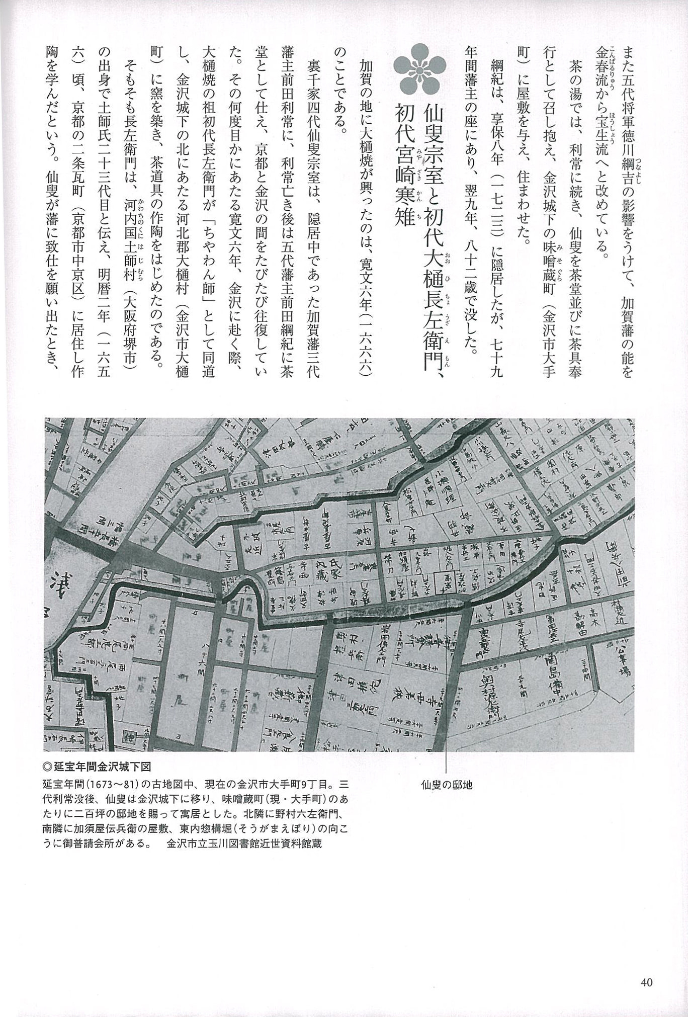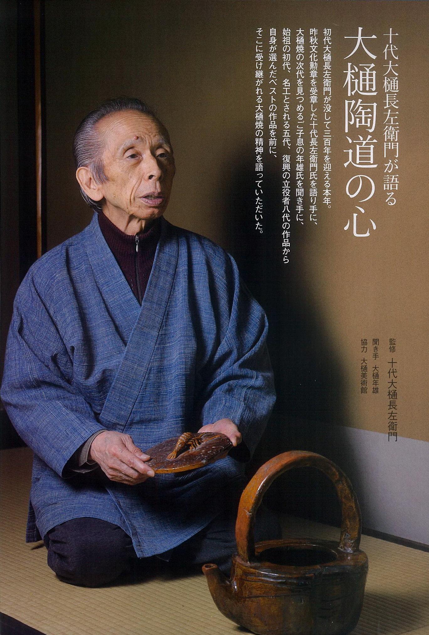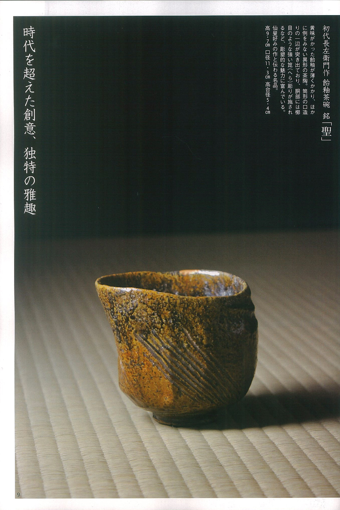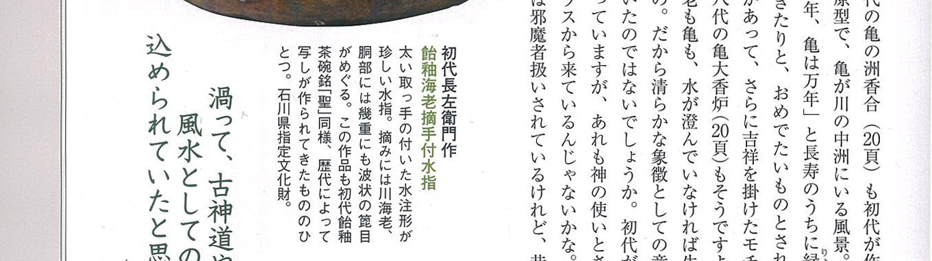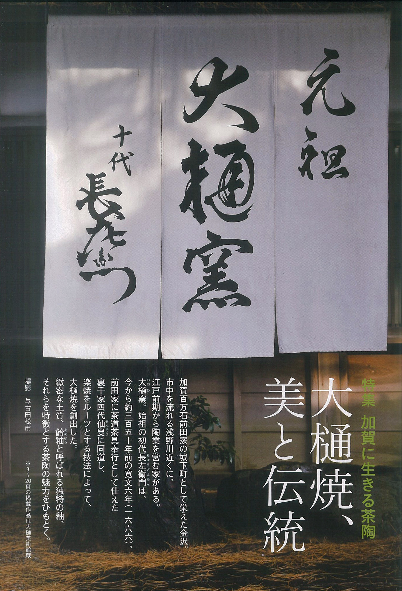 寛文6年(1666年)に加賀藩5代前田綱紀候のもとに茶道茶具奉行として、裏千家4代仙叟宗室居士が初代大樋長左衛門を同道させて金沢の地に楽焼の技法を伝えることとなり、仙叟好みなど飴釉を中心とした造形美あふれる作品を残し、その作風は昨年文化勲章を受章した10代長左衛門まで脈々と受け継がれております。本年は初代長左衛門没後300年にあたり石川県指定文化財「飴釉海老摘手付水指」、「黒飴釉烏香炉」「飴釉茶碗 銘 聖」などの初代の代表的な作品や、「仙叟手造り飴釉瓢形茶入」、また大樋歴代そして大樋家とのゆかりの方々の作品、また同時に収蔵から選んだ12カ月茶碗の優品などを陳列いたします。