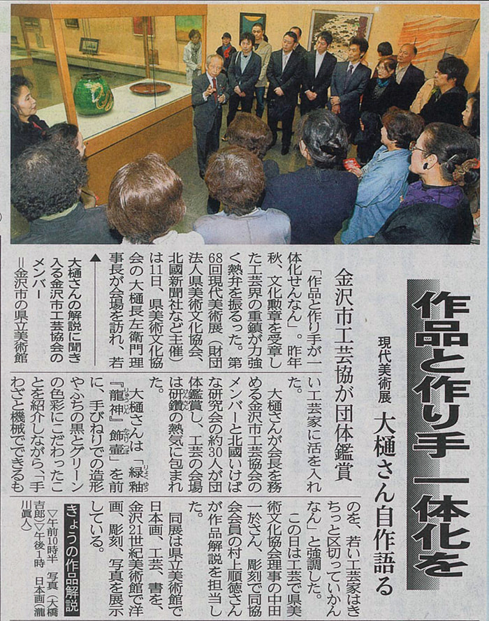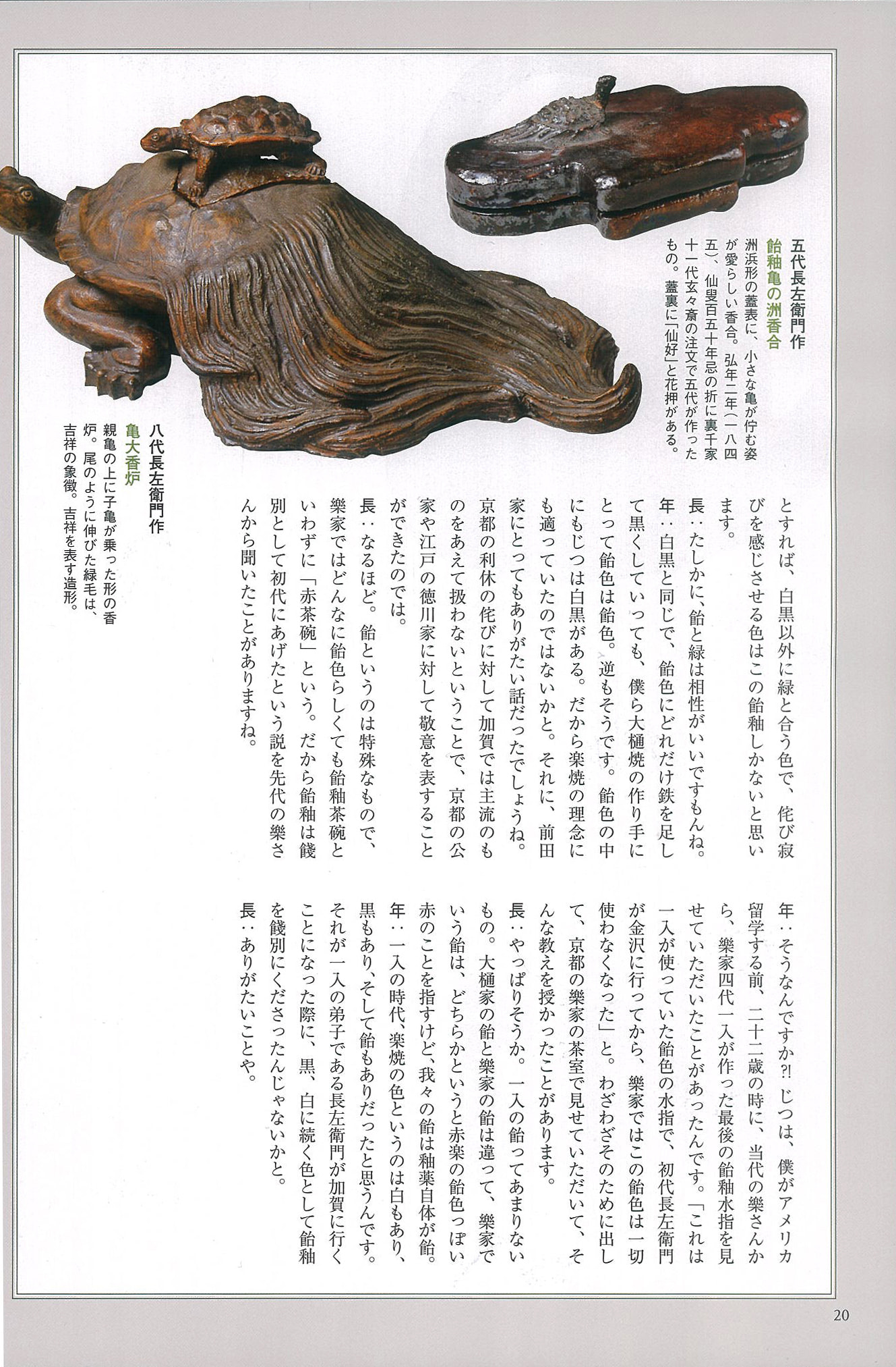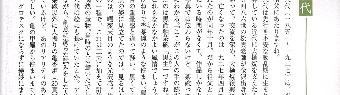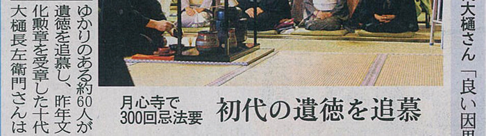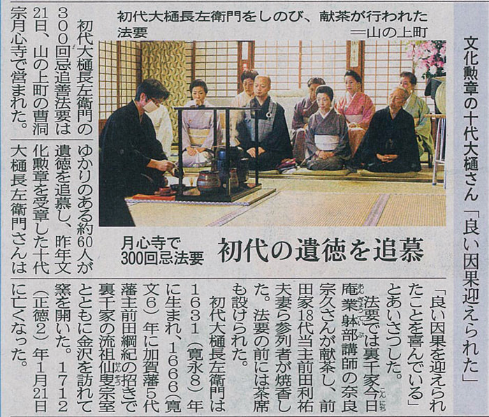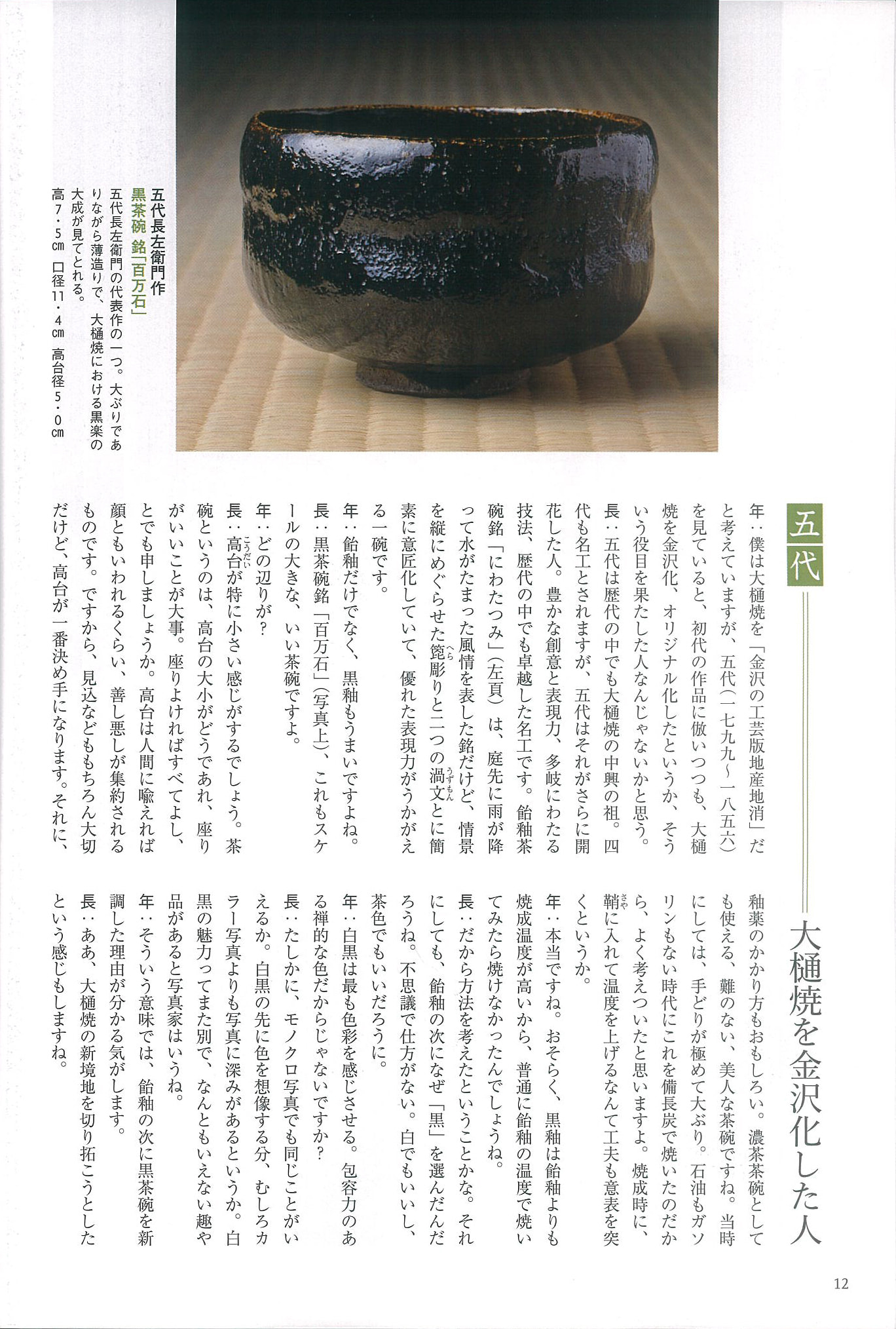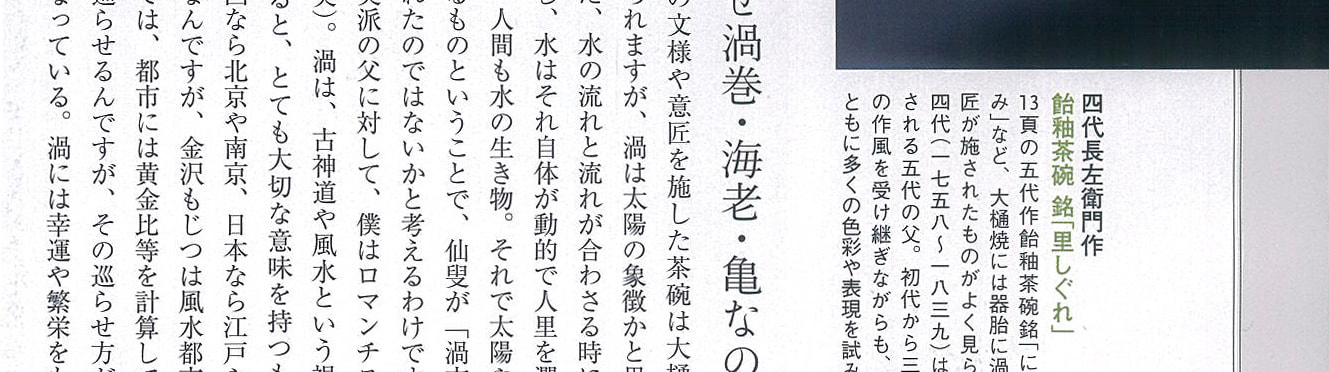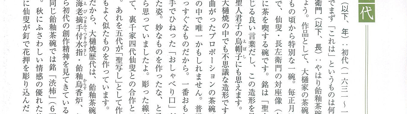 寛文6年(1666年)に加賀藩5代前田綱紀候のもとに茶道茶具奉行として、裏千家4代仙叟宗室居士が初代大樋長左衛門を同道させて金沢の地に楽焼の技法を伝えることとなり、仙叟好みなど飴釉を中心とした造形美あふれる作品を残し、その作風は昨年文化勲章を受章した10代長左衛門まで脈々と受け継がれております。本年は初代長左衛門没後300年にあたり石川県指定文化財「飴釉海老摘手付水指」、「黒飴釉烏香炉」「飴釉茶碗 銘 聖」などの初代の代表的な作品や、「仙叟手造り飴釉瓢形茶入」、また大樋歴代そして大樋家とのゆかりの方々の作品、また同時に収蔵から選んだ12カ月茶碗の優品などを陳列いたします。