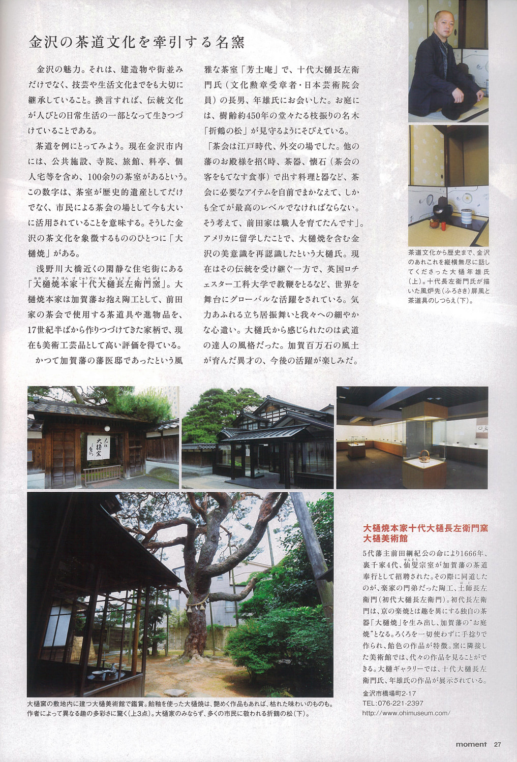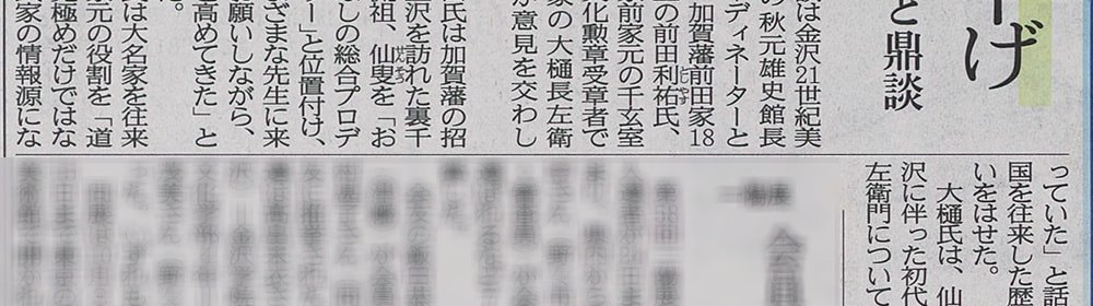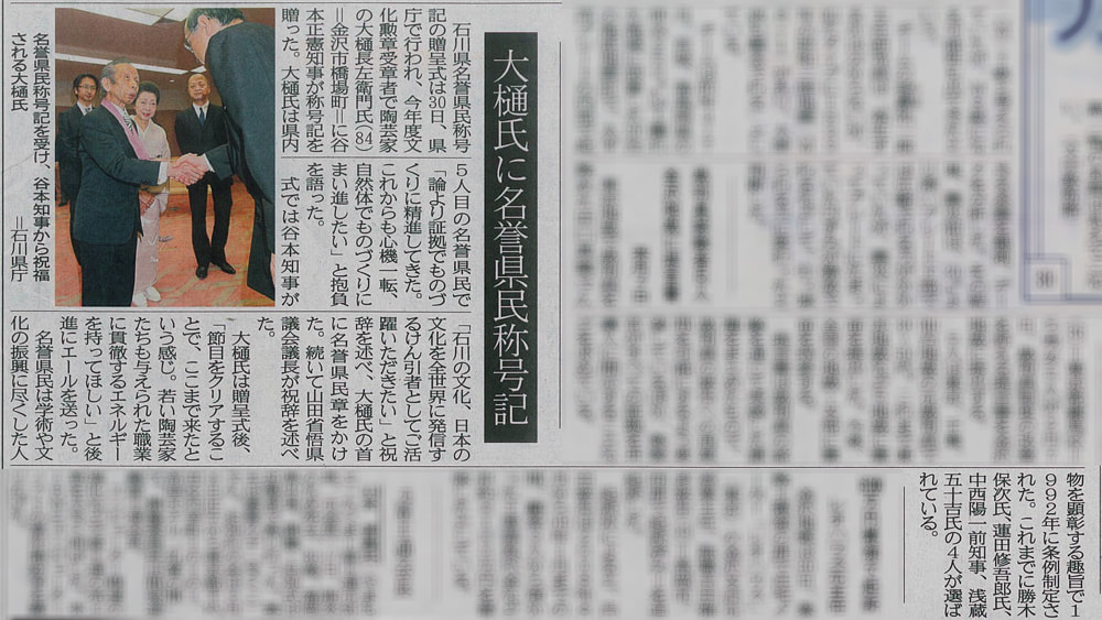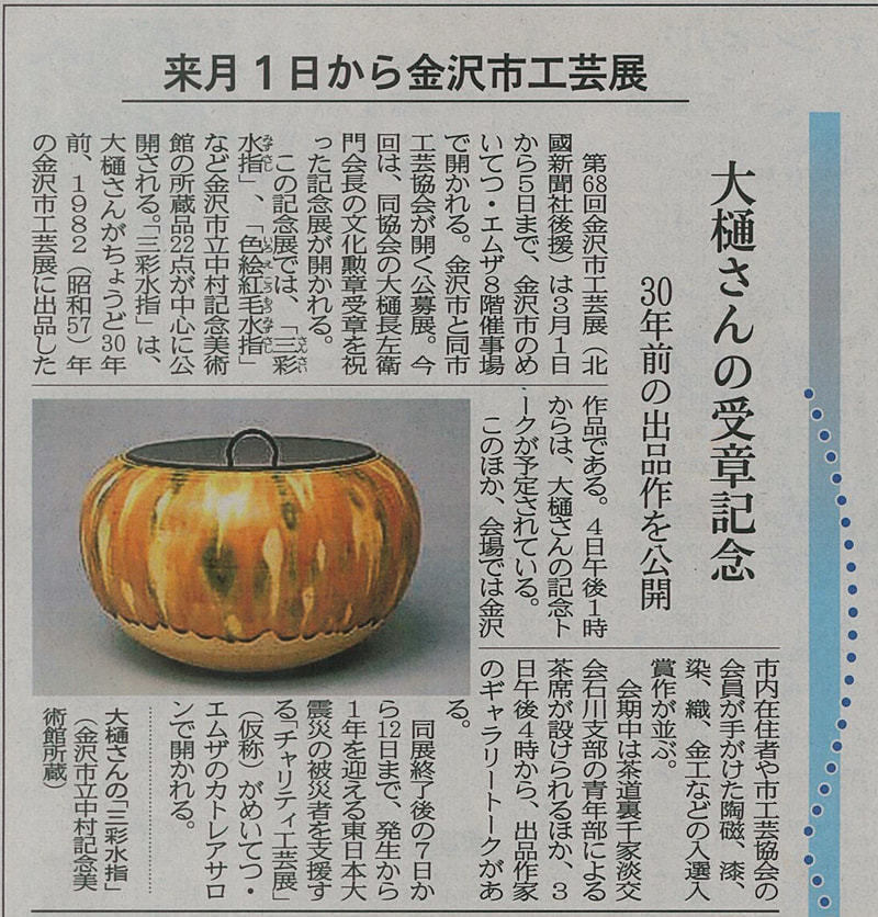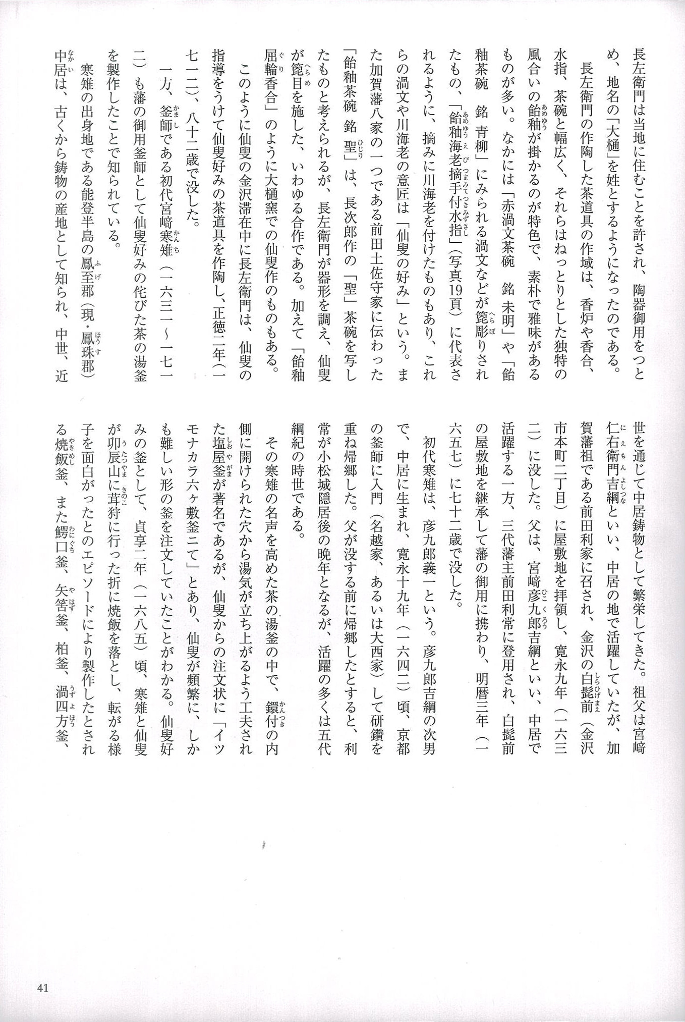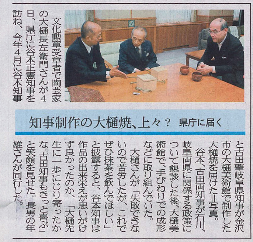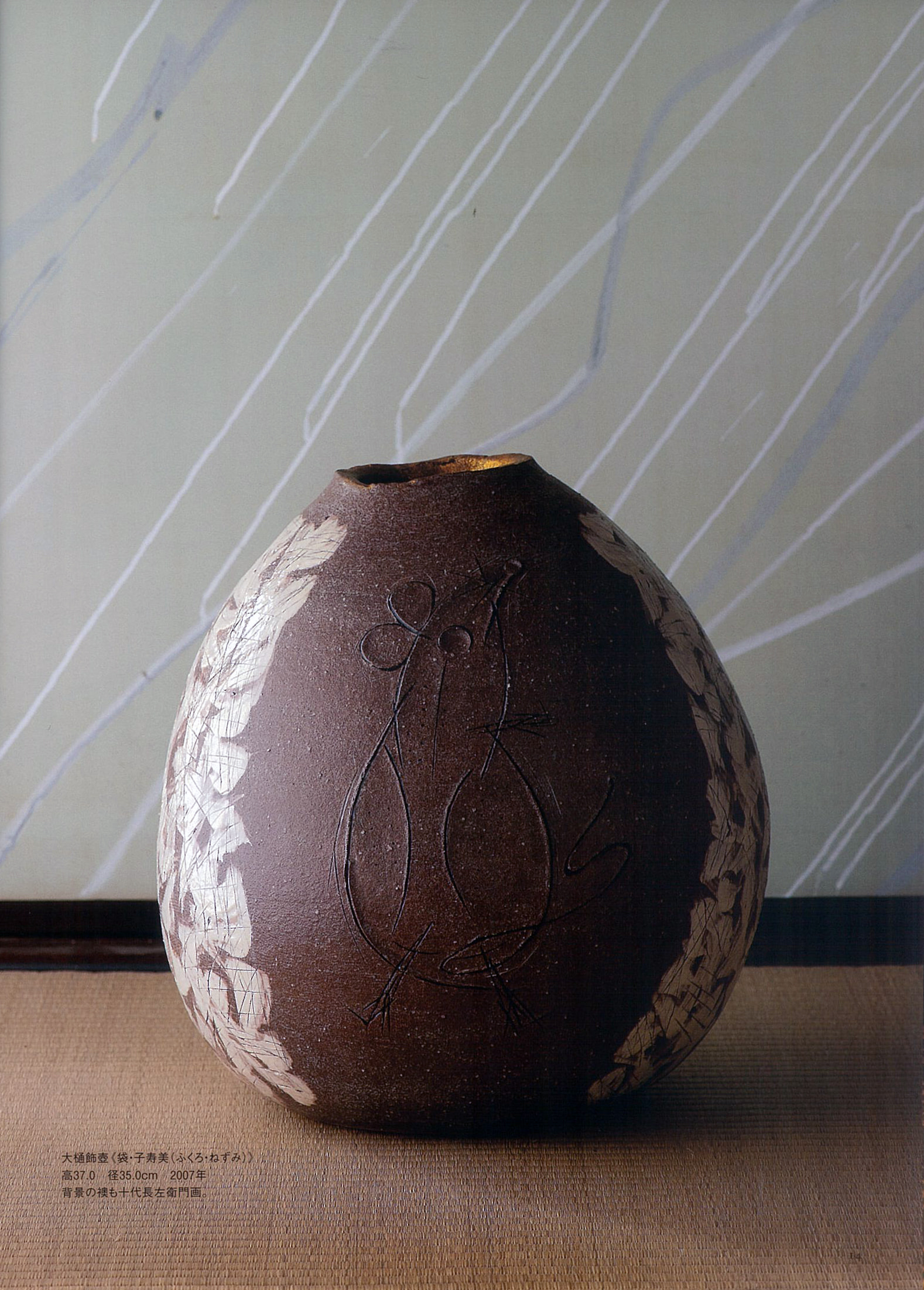 寛文6年(1666年)に加賀藩5代前田綱紀候のもとに茶道茶具奉行として、裏千家4代仙叟宗室居士が初代大樋長左衛門を同道させて金沢の地に楽焼の技法を伝えることとなり、仙叟好みなど飴釉を中心とした造形美あふれる作品を残し、その作風は昨年文化勲章を受章した10代長左衛門まで脈々と受け継がれております。本年は初代長左衛門没後300年にあたり石川県指定文化財「飴釉海老摘手付水指」、「黒飴釉烏香炉」「飴釉茶碗 銘 聖」などの初代の代表的な作品や、「仙叟手造り飴釉瓢形茶入」、また大樋歴代そして大樋家とのゆかりの方々の作品、また同時に収蔵から選んだ12カ月茶碗の優品などを陳列いたします。