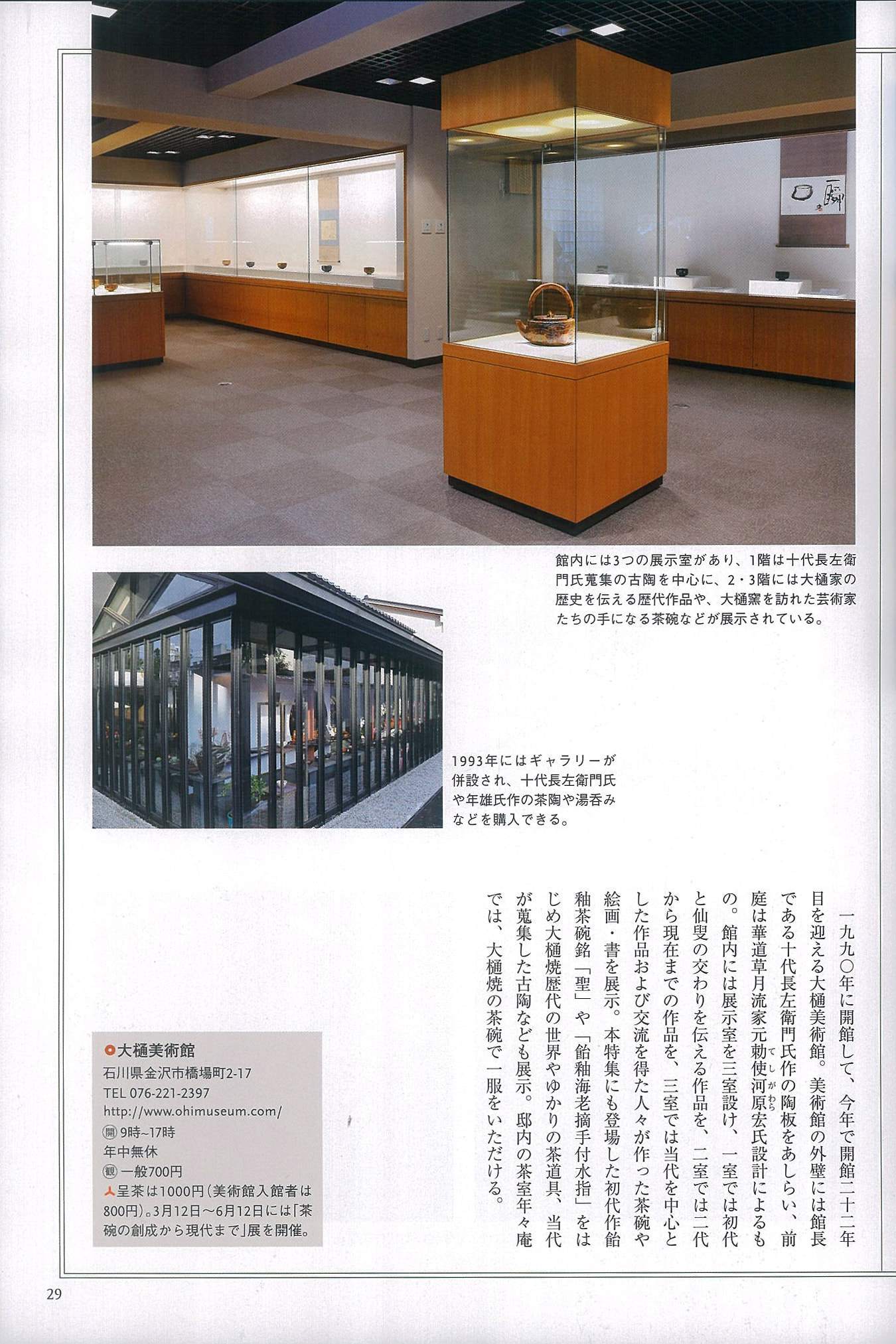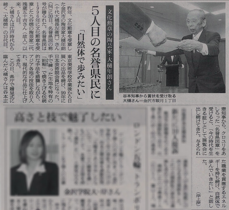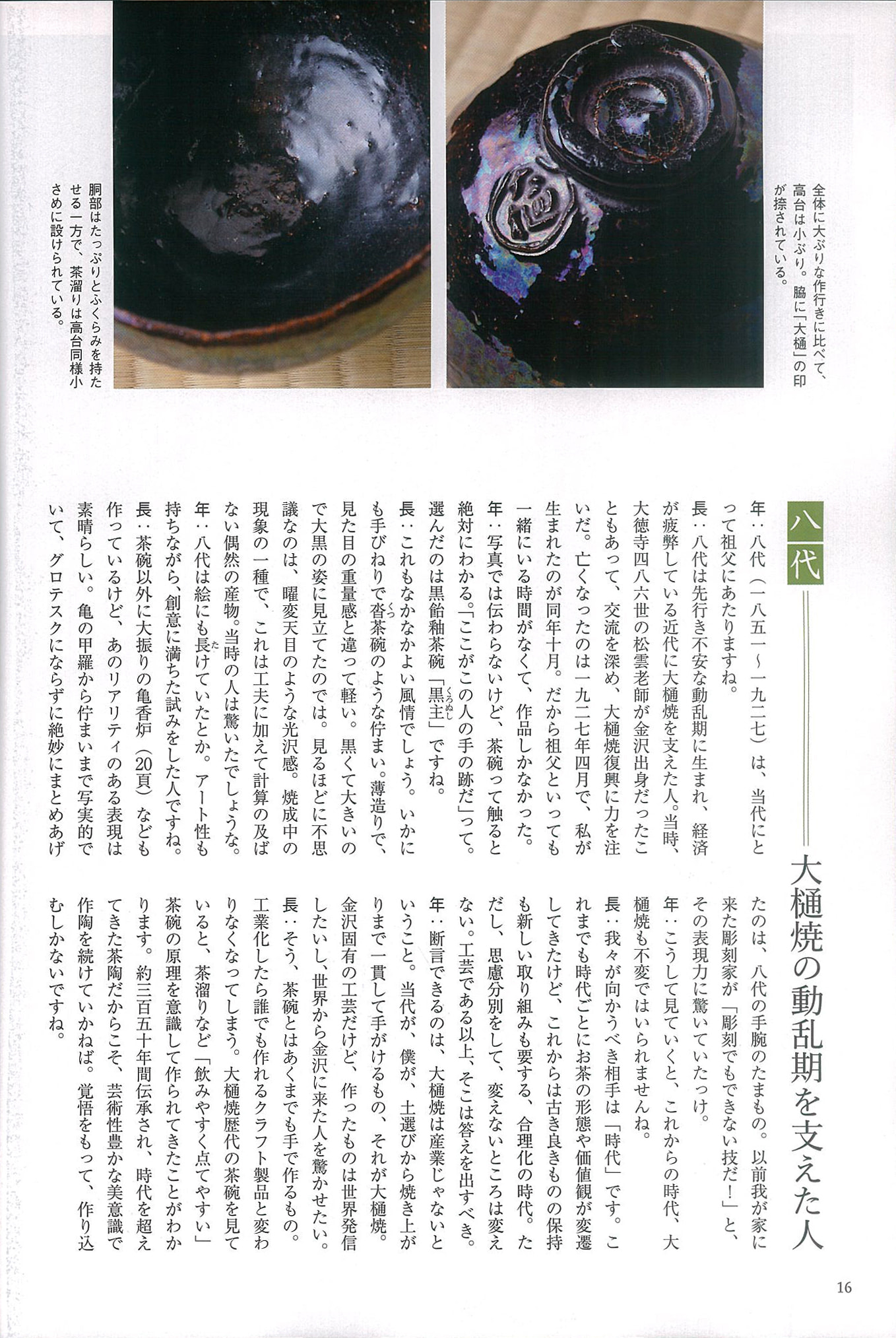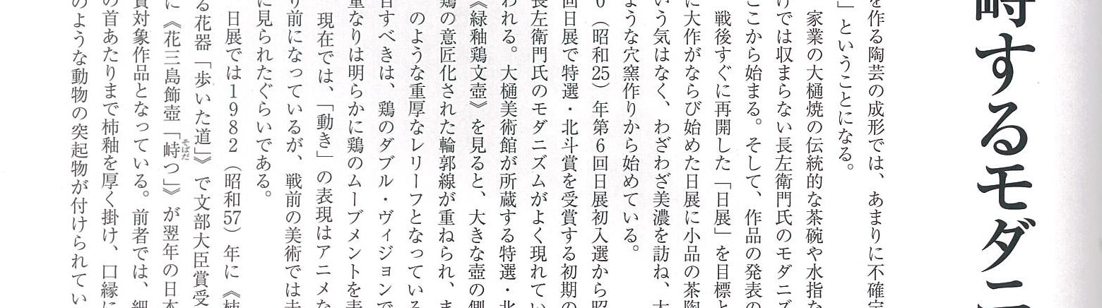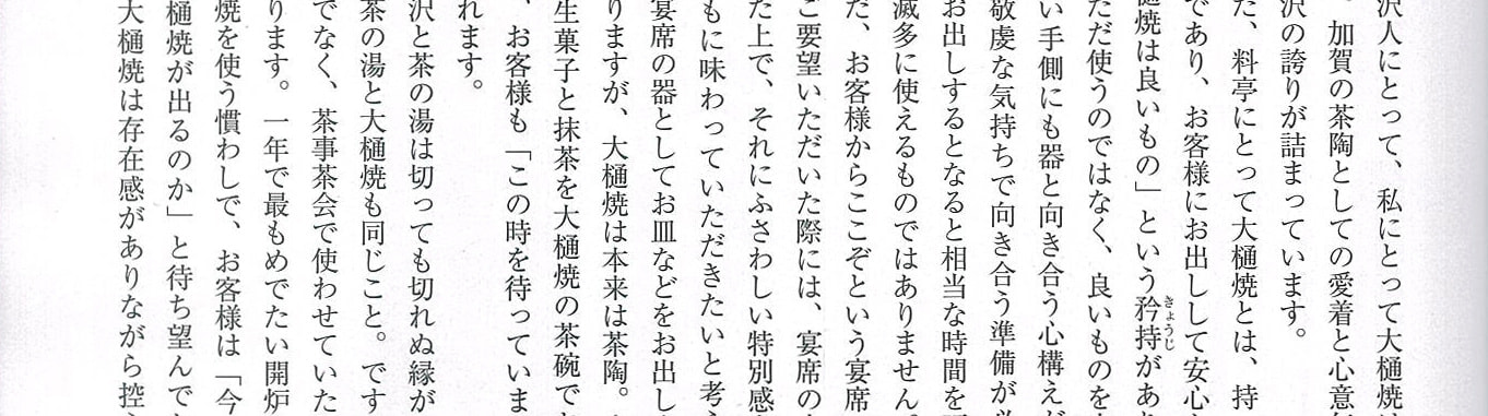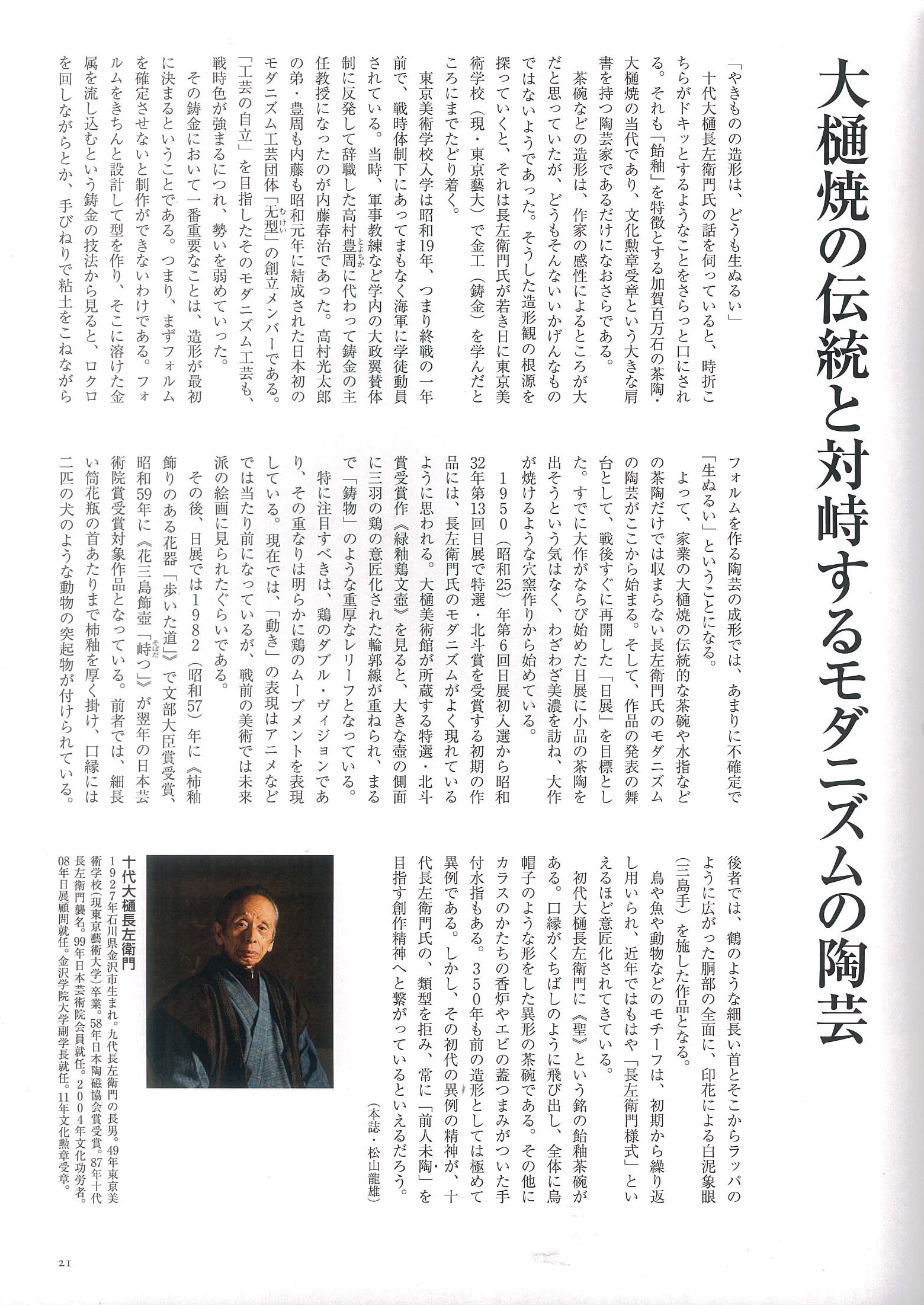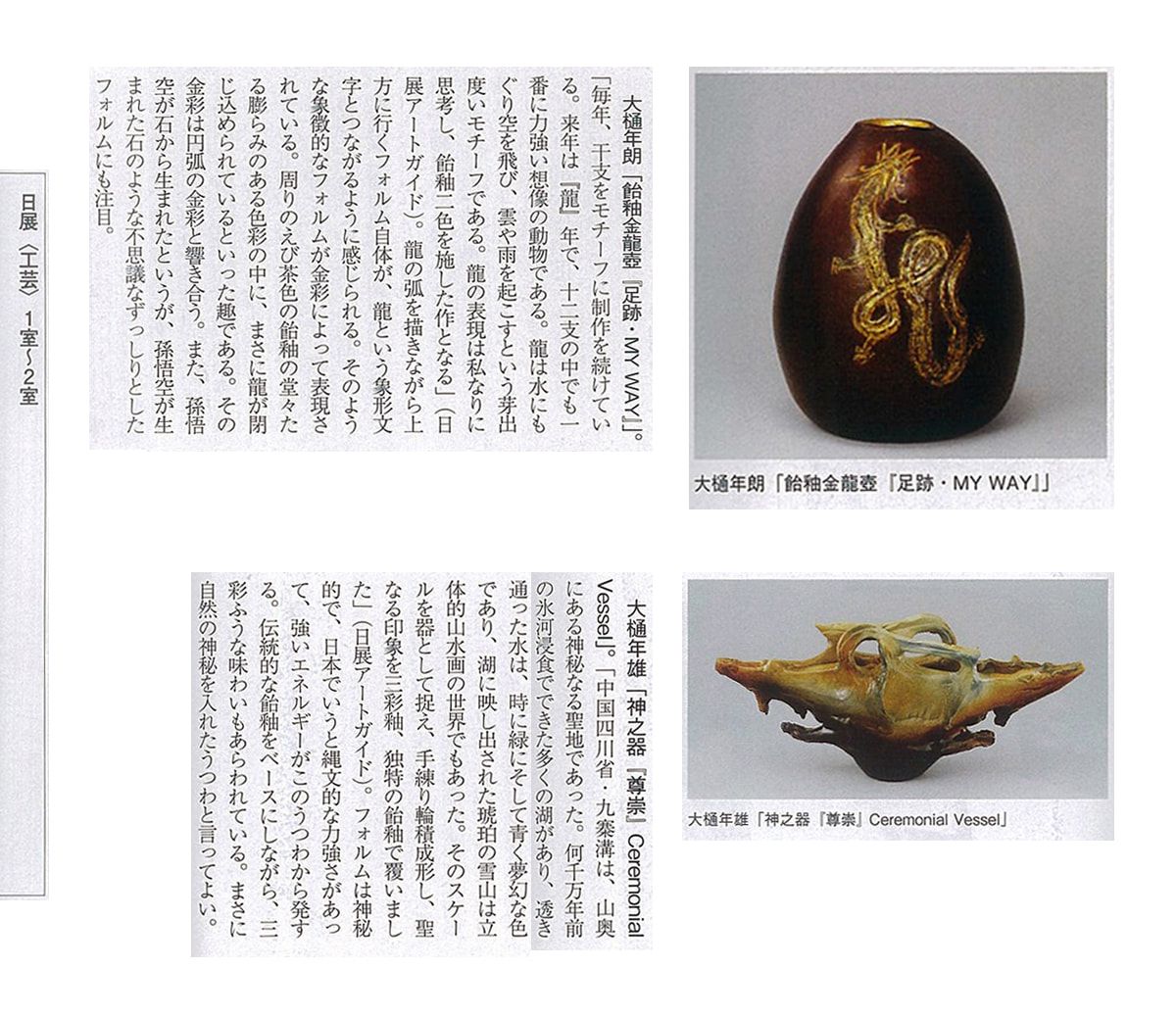 寛文6年(1666年)に加賀藩5代前田綱紀候のもとに茶道茶具奉行として、裏千家4代仙叟宗室居士が初代大樋長左衛門を同道させて金沢の地に楽焼の技法を伝えることとなり、仙叟好みなど飴釉を中心とした造形美あふれる作品を残し、その作風は昨年文化勲章を受章した10代長左衛門まで脈々と受け継がれております。本年は初代長左衛門没後300年にあたり石川県指定文化財「飴釉海老摘手付水指」、「黒飴釉烏香炉」「飴釉茶碗 銘 聖」などの初代の代表的な作品や、「仙叟手造り飴釉瓢形茶入」、また大樋歴代そして大樋家とのゆかりの方々の作品、また同時に収蔵から選んだ12カ月茶碗の優品などを陳列いたします。