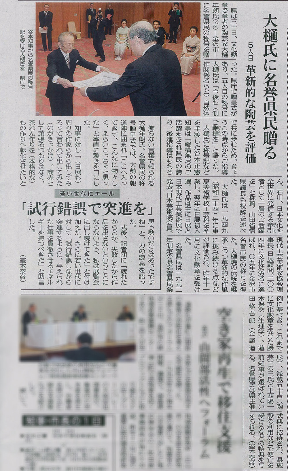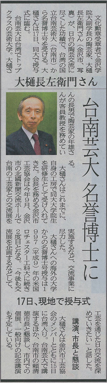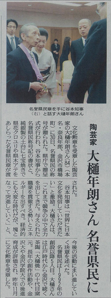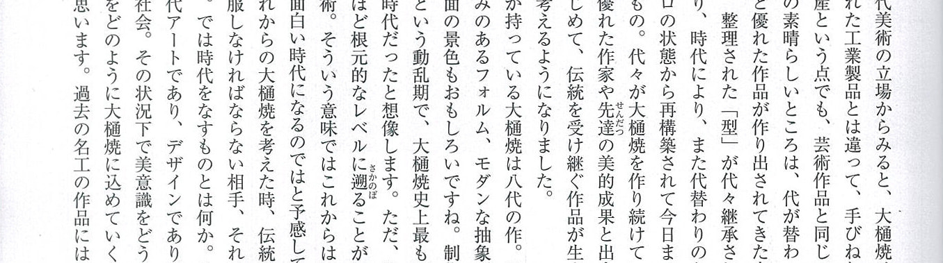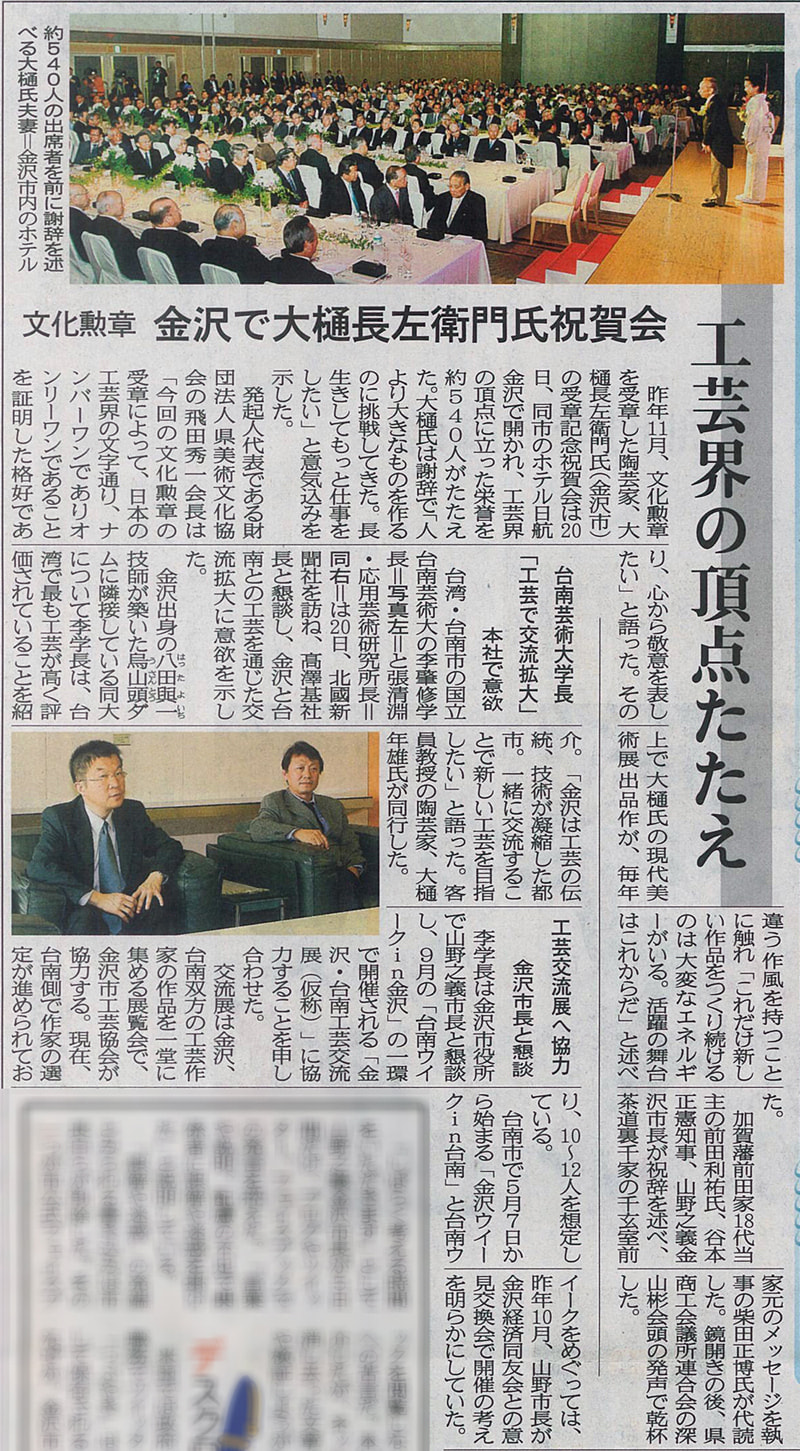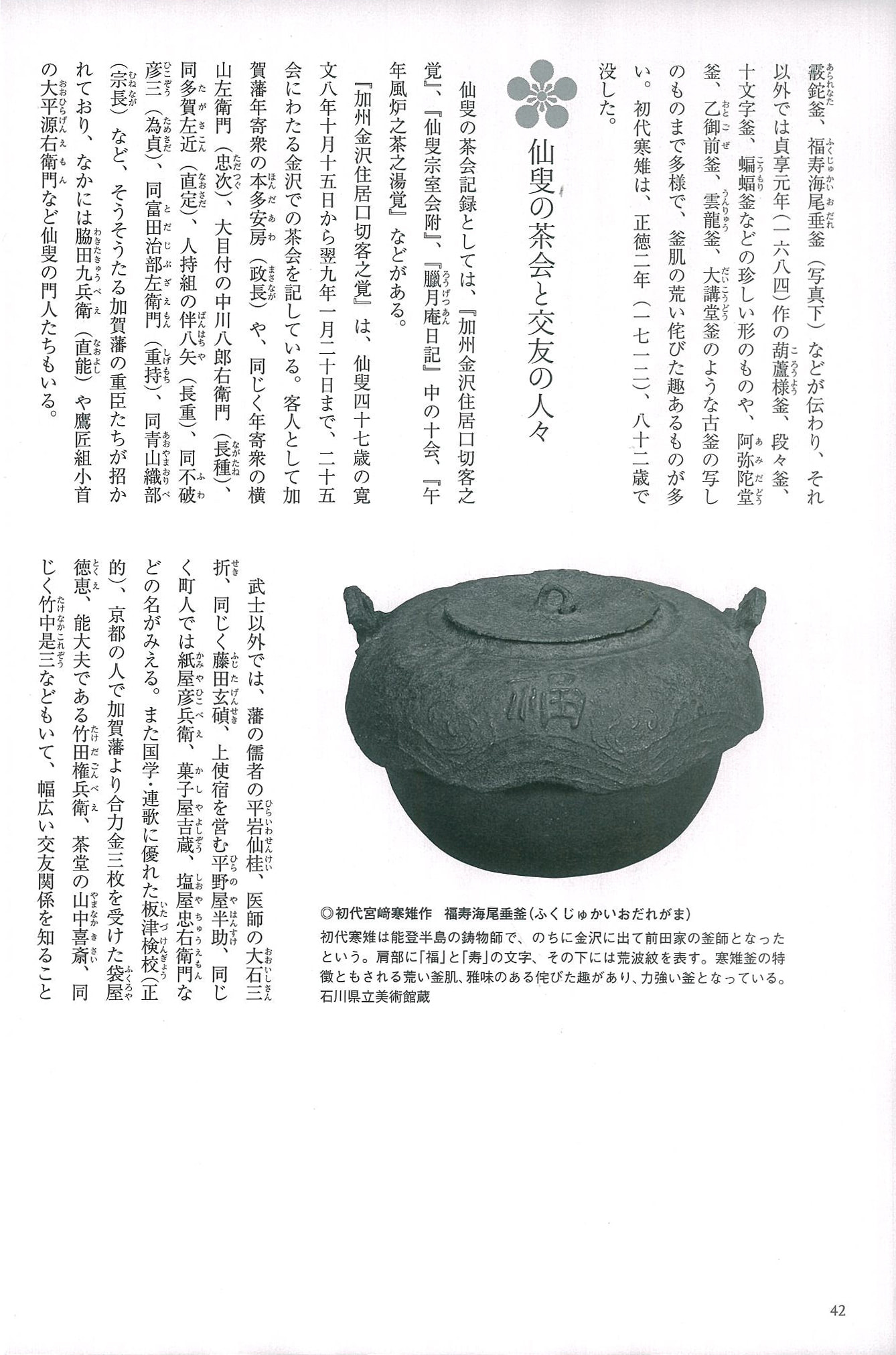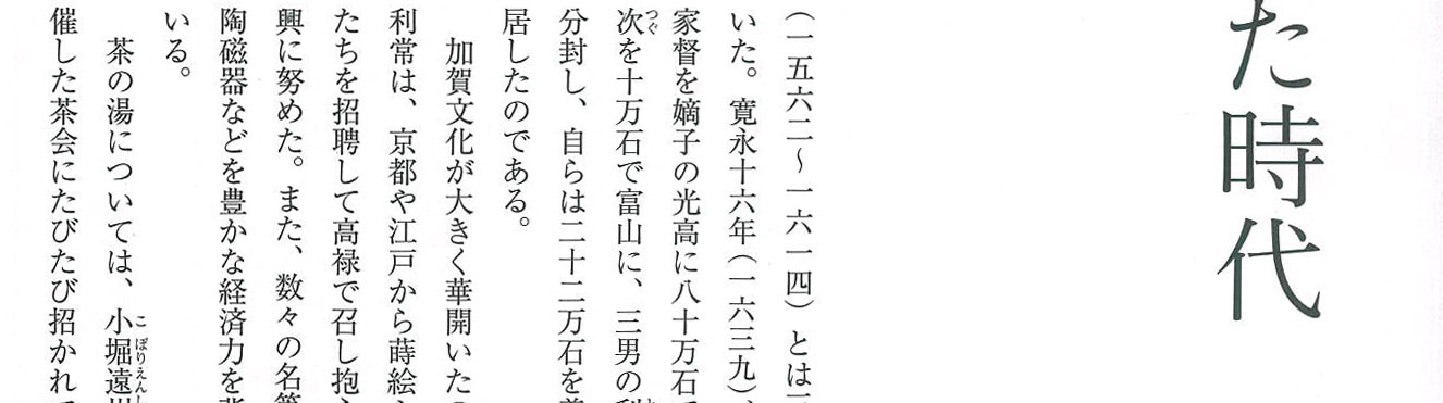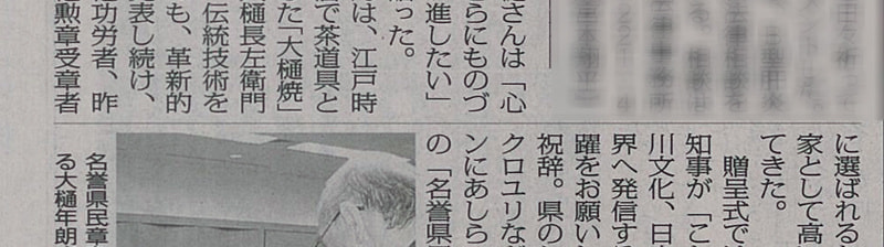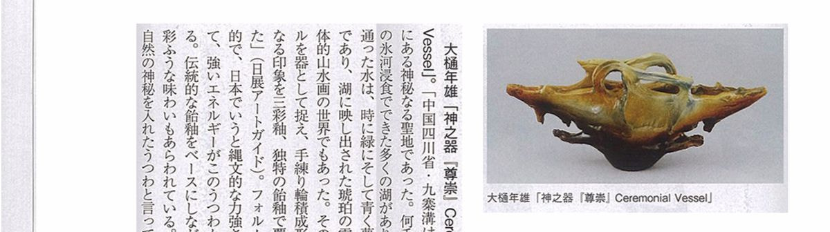 寛文6年(1666年)に加賀藩5代前田綱紀候のもとに茶道茶具奉行として、裏千家4代仙叟宗室居士が初代大樋長左衛門を同道させて金沢の地に楽焼の技法を伝えることとなり、仙叟好みなど飴釉を中心とした造形美あふれる作品を残し、その作風は昨年文化勲章を受章した10代長左衛門まで脈々と受け継がれております。本年は初代長左衛門没後300年にあたり石川県指定文化財「飴釉海老摘手付水指」、「黒飴釉烏香炉」「飴釉茶碗 銘 聖」などの初代の代表的な作品や、「仙叟手造り飴釉瓢形茶入」、また大樋歴代そして大樋家とのゆかりの方々の作品、また同時に収蔵から選んだ12カ月茶碗の優品などを陳列いたします。