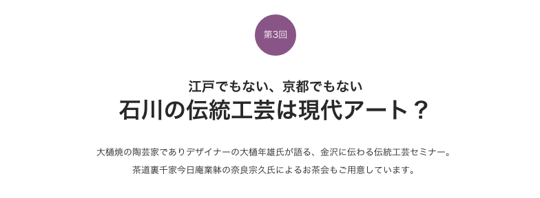 大樋焼の陶芸家でありデザイナーの大樋年雄氏が語る、金沢に伝わる伝統工芸セミナー。