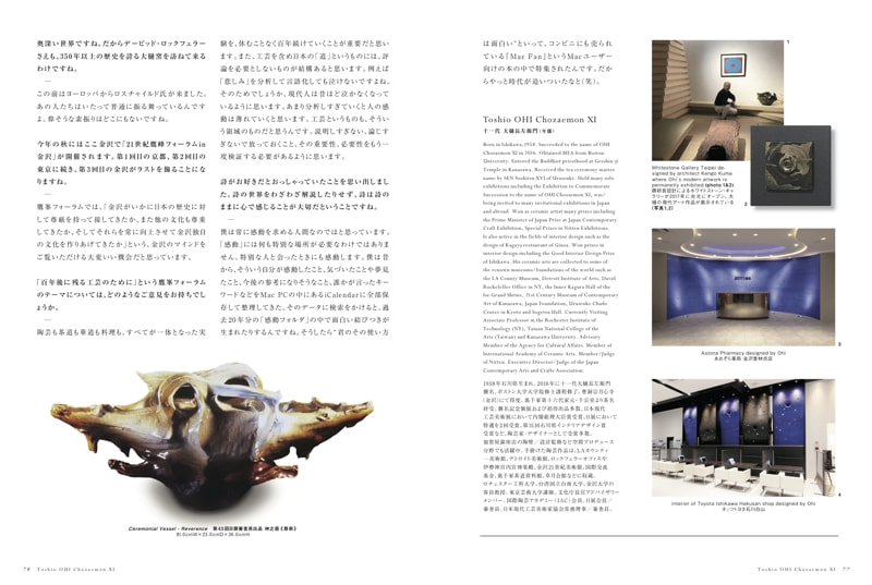 曜変天目研究家の Jean GIREL 氏の茶碗と私、十一代大樋長左衛門の茶碗、隈研吾氏設計のポリゴニウムを用いた空間で藝大茶道部の学生がもてなす