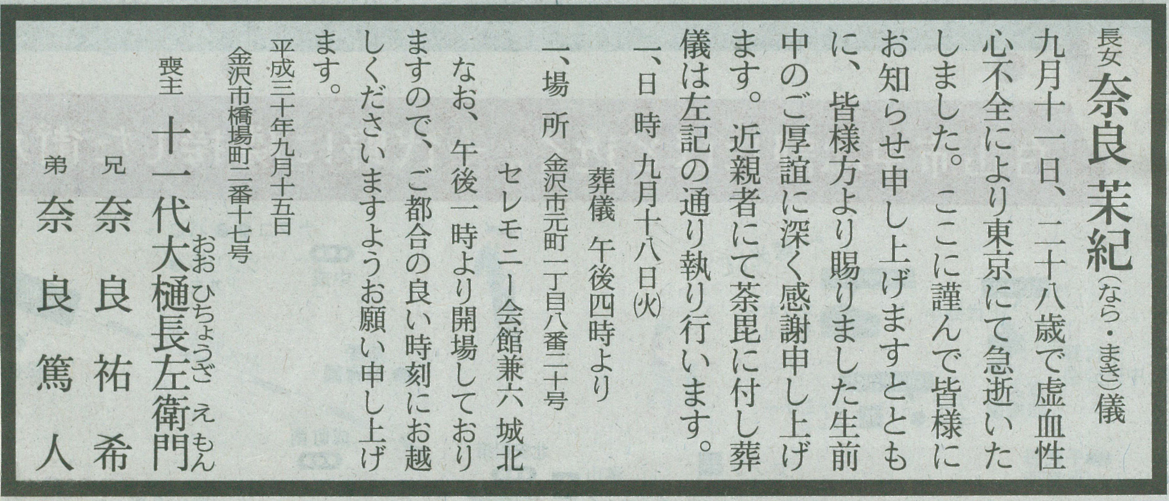 長女 奈良茉紀(なら・まき)は九月十一日、二十八才、虚血性心不全により東京にて急逝いたしました。